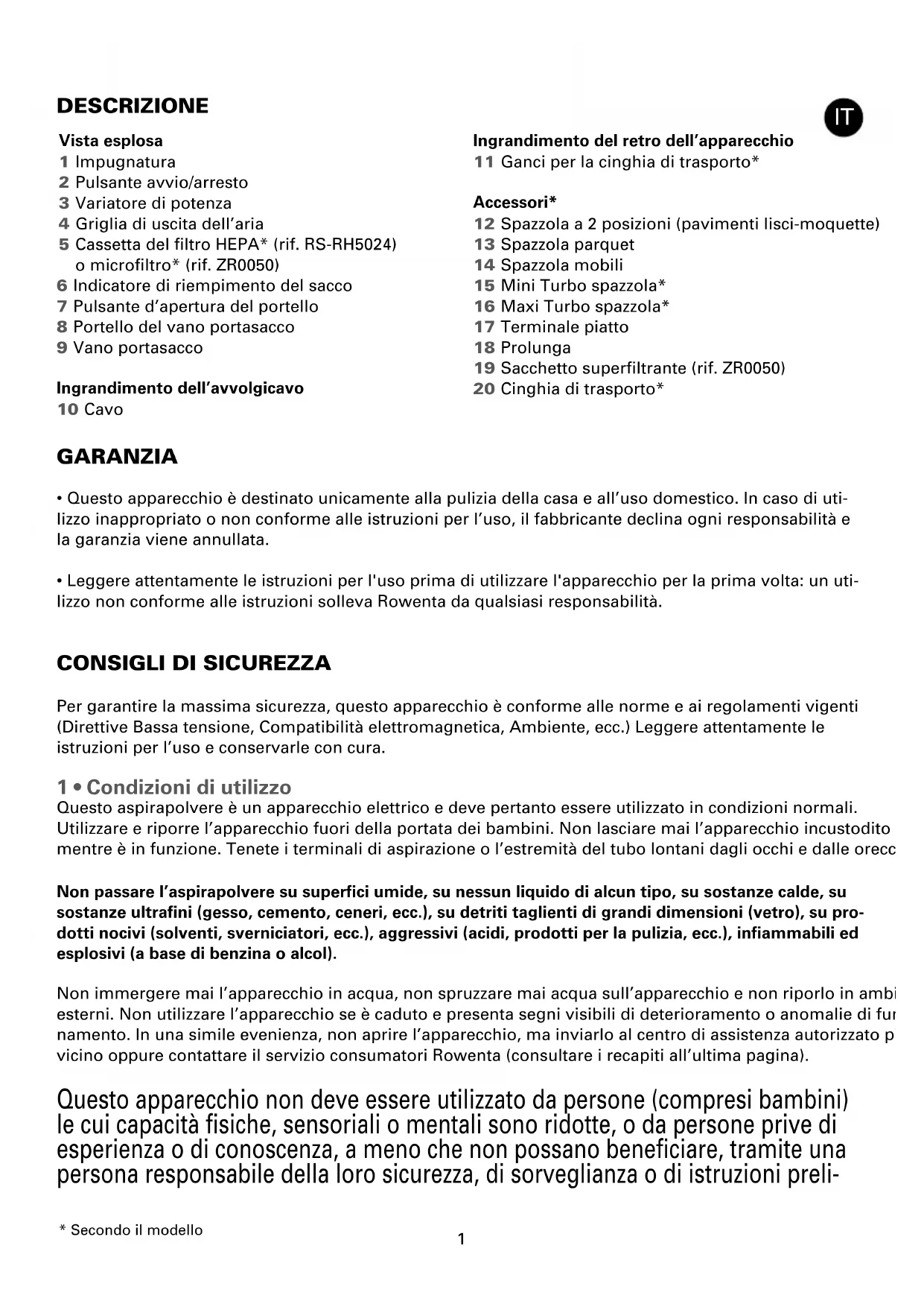 Per garantire la massima sicurezza, questo apparecchio è conforme alle norme e ai regolamenti vigenti (Direttive Bassa tensione, Compatibilità elettromagnetica, Ambiente, ecc.) Leggere attentamente le istruzioni per l’uso e conservarle con cura. 1 • Condizioni di utilizzo Questo aspirapolvere è un apparecchio elettrico e deve pertanto essere utilizzato in condizioni normali. Utilizzare e riporre l’apparecchio fuori della portata dei bambini. Non lasciare mai l’apparecchio incustodito mentre è in funzione. Tenete i terminali di aspirazione o l’estremità del tubo lontani dagli occhi e dalle orecchie. Non passare l’aspirapolvere su superfici umide, su nessun liquido di alcun tipo, su sostanze calde, su sostanze ultrafini (gesso, cemento, ceneri, ecc.), su detriti taglienti di grandi dimensioni (vetro), su pro- dotti nocivi (solventi, sverniciatori, ecc.), aggressivi (acidi, prodotti per la pulizia, ecc.), infiammabili ed esplosivi (a base di benzina o alcol). Non immergere mai l’apparecchio in acqua, non spruzzare mai acqua sull’apparecchio e non riporlo in ambienti esterni. Non utilizzare l’apparecchio se è caduto e presenta segni visibili di deterioramento o anomalie di funzio- namento. In una simile evenienza, non aprire l’apparecchio, ma inviarlo al centro di assistenza autorizzato più vicino oppure contattare il servizio consumatori Rowenta (consultare i recapiti all’ultima pagina). Questo apparecchio non deve essere utilizzato da persone (compresi bambini) le cui capacità fisiche, sensoriali o mentali sono ridotte, o da persone prive di esperienza o di conoscenza, a meno che non possano beneficiare, tramite una persona responsabile della loro sicurezza, di sorveglianza o di istruzioni preli-