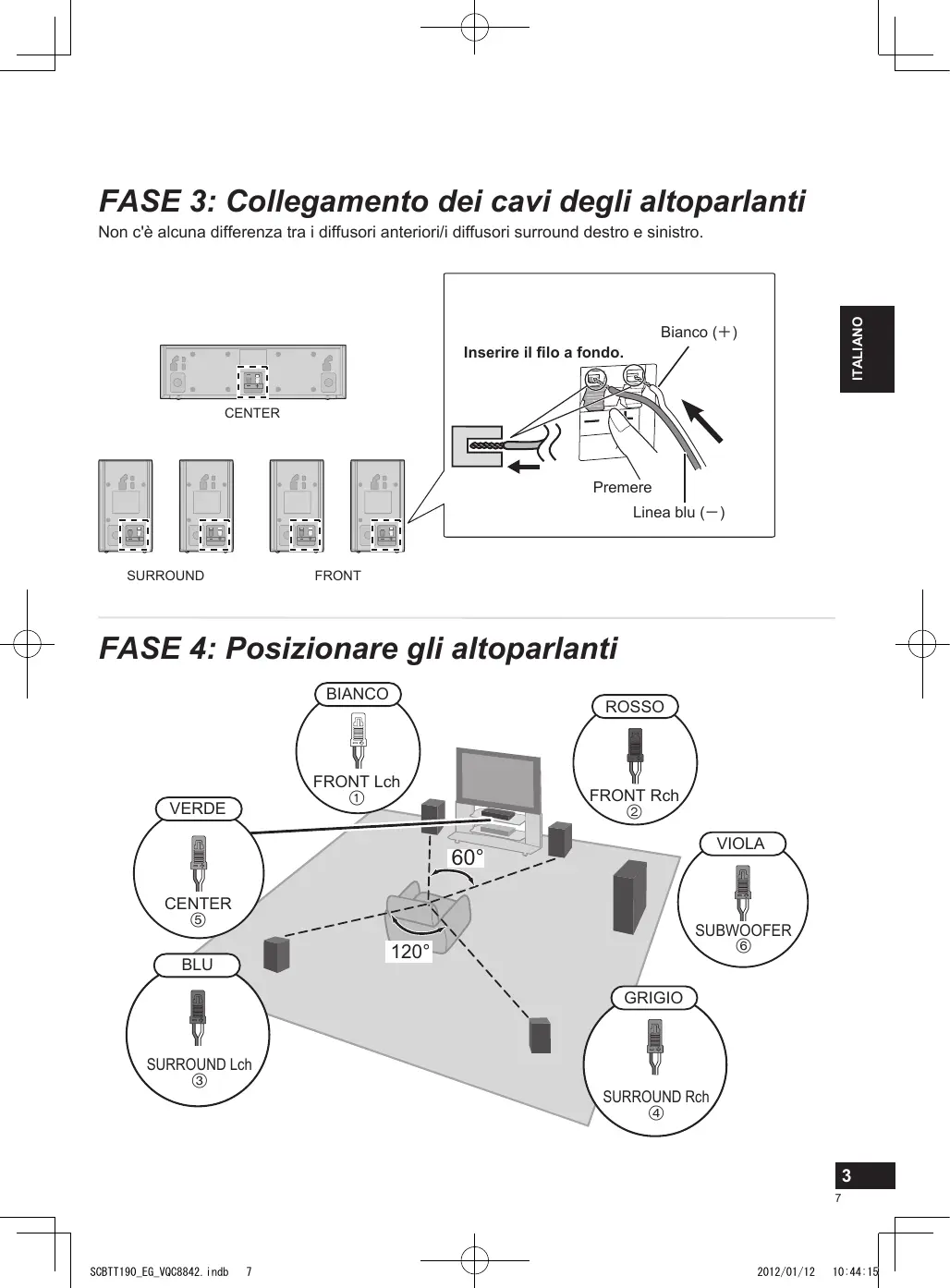 2012/01/12 10:44:15 DEUTSCH FASE 3: Collegamento dei cavi degli altoparlanti ITALIANO Non c'è alcuna differenza tra i diffusori anteriori/i diffusori surround destro e sinistro. Bianco (i) Inserire il filo a fondo. FRANÇAIS CENTER Premere FRONT NEDERLANDS SURROUND ESPAÑOL Linea blu (j) FASE 4: Posizionare gli altoparlanti BIANCO FRONT Lch FRONT Rch