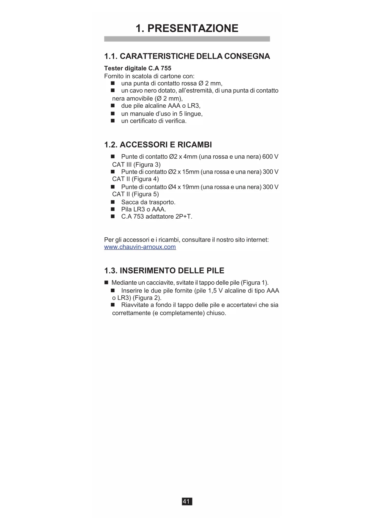 Punte di contatto Ø2 x 4mm (una rossa e una nera) 600 V CAT III (Figura 3) Punte di contatto Ø2 x 15mm (una rossa e una nera) 300 V CAT II (Figura 4) Punte di contatto Ø4 x 19mm (una rossa e una nera) 300 V CAT II (Figura 5) Sacca da trasporto. Pila LR3 o AAA. C.A 753 adattatore 2P+T. Per gli accessori e i ricambi, consultare il nostro sito internet: www.chauvin-arnoux.com