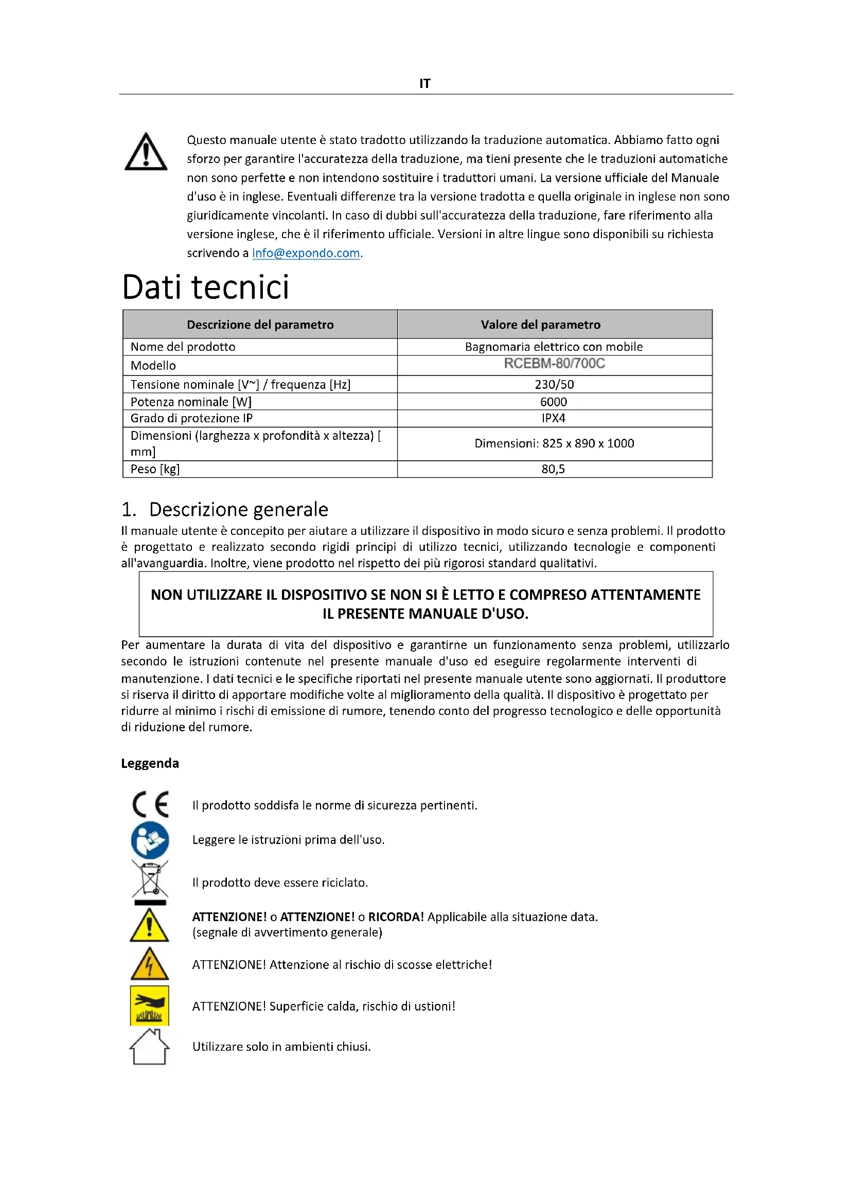 Questo manuale utente è stato tradotto utilizzando la traduzione automatica. Abbiamo fatto ogni sforzo per garantire l'accuratezza della traduzione, ma tieni presente che le traduzioni automatiche non sono perfette e non intendono sostituire i traduttori umani. La versione ufficiale del Manuale d'uso è in inglese. Eventuali differenze tra la versione tradotta e quella originale in inglese non sono giuridicamente vincolanti. In caso di dubbi sull'accuratezza della traduzione, fare riferimento alla versione inglese, che è il riferimento ufficiale. Versioni in altre lingue sono disponibili su richiesta scrivendo a info@expondo.com. Dati tecnici Descrizione del parametro Valore del parametro Nome del prodotto Bagnomaria elettrico con mobile Modello