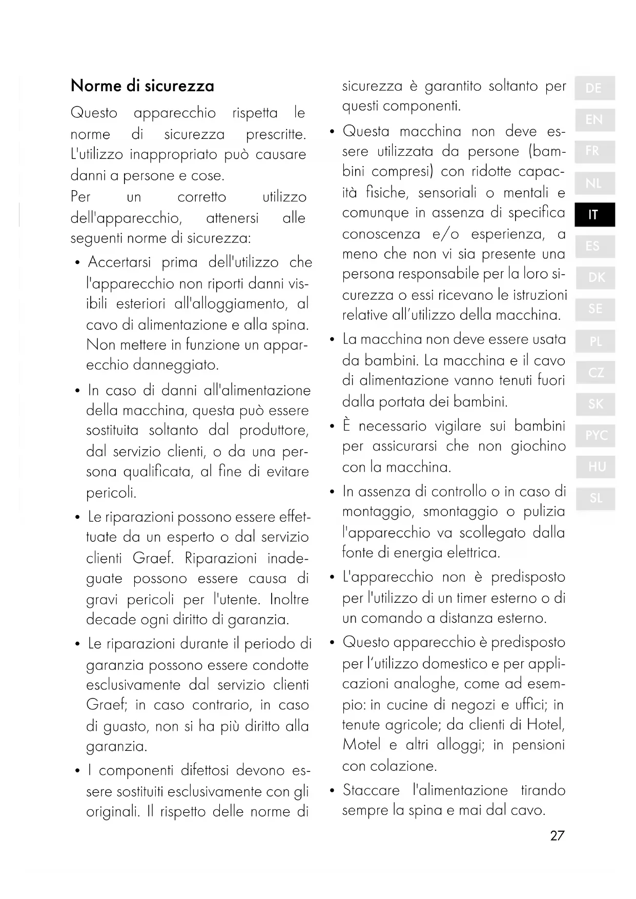 - Ungere le guide una volta al mese con alcune gocce d'olio o di vasellina. Rimuo- vere l'olio o la vasellina in eccesso con un batuffolo di cotone. Servizio clienti In caso di guasto dell‘apparecchio Graef, rivolgersi ad un centro specializzato o al servizio clienti Graef. Smaltimento Questo prodotto a conclusione del suo uti- lizzo non può essere gettato in un normale contenitore dei rifiuti, ma deve essere con- segnato in un centro raccolta differenziata per il riciclo dei rifiuti elettronici Il simbolo presente sul prodotto e nelle istruzioni si ri- ferisce a questo. I materiali sono riutilizzabili in base alla loro marcatura. Attraverso il ri- ciclo, il riutilizzo dei materiali o altre forme di riutilizzo di apparecchi fuori uso, si contribu- isce notevolmente alla difesa dell‘ambiente. Richieda maggiori informazioni presso la Sua amministrazione comunale riguardo alle possibilità di smaltimento. 2 anni di garanzia del motore Questo prodotto è inoltre munito di una garanzia del motore di 24 mesi a partire dalla data d‘aquisto. La garanzia non co- pre i guasti causati da un cattivo utilizzo o manomissione, come pure difetti che hanno un‘influenza minima sulle funzioni o sul valo- re dell‘apparecchio. Inoltre i danni che so- praggiungono a seguito di trasporto, nella misura in cui noi non ne siamo responsabili, non sono coperti da garanzia. I guasti so- praggiunti a seguito di una riparazione che non è stata effettuata né da noi né da nostri delegati, non sono coperti da garanzia. In caso di reclamo effettueremo le dovute ripa- razioni sul prodotto secondo i nostri criteri o provvederemo alla sua sostituzione.32 Indicaciones de seguridad Este aparato cumple las disposicio- nes en materia de seguridad requeri- das. No obstante, si se utiliza de ma- nera indebida puede causar daños personales y materiales. Para utilizar de manera segura el aparato, tenga en cuenta las indi- caciones de seguridad que se detal- lan a continuación: