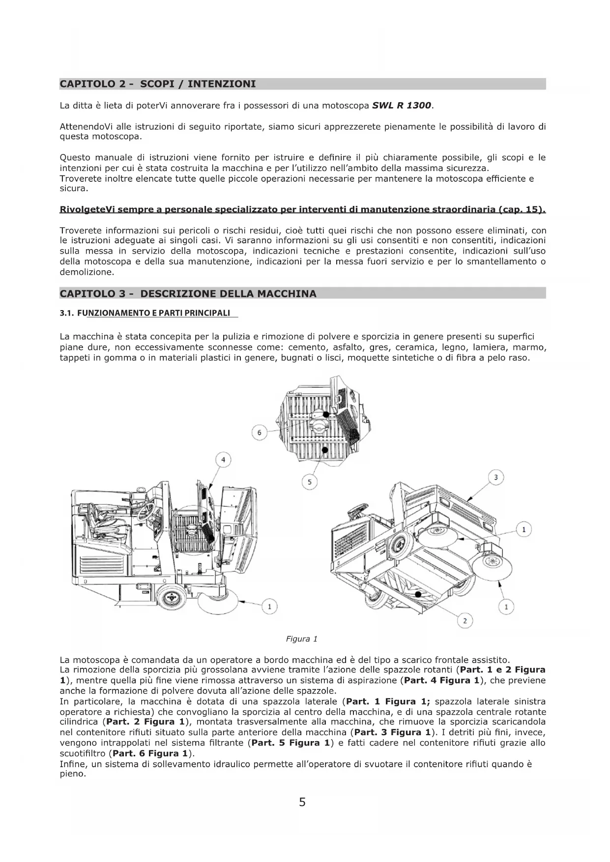 La macchina è stata concepita per la pulizia e rimozione di polvere e sporcizia in genere presenti su superci piane dure, non eccessivamente sconnesse come: cemento, asfalto, gres, ceramica, legno, lamiera, marmo, tappeti in gomma o in materiali plastici in genere, bugnati o lisci, moquette sintetiche o di bra a pelo raso. Figura 1 La motoscopa è comandata da un operatore a bordo macchina ed è del tipo a scarico frontale assistito. La rimozione della sporcizia più grossolana avviene tramite l’azione delle spazzole rotanti (Part. 1 e 2 Figura 1), mentre quella più ne viene rimossa attraverso un sistema di aspirazione (Part. 4 Figura 1), che previene anche la formazione di polvere dovuta all’azione delle spazzole. In particolare, la macchina è dotata di una spazzola laterale (Part. 1 Figura 1; spazzola laterale sinistra operatore a richiesta) che convogliano la sporcizia al centro della macchina, e di una spazzola centrale rotante cilindrica (Part. 2 Figura 1), montata trasversalmente alla macchina, che rimuove la sporcizia scaricandola nel contenitore riuti situato sulla parte anteriore della macchina (Part. 3 Figura 1). I detriti più ni, invece, vengono intrappolati nel sistema ltrante (Part. 5 Figura 1) e fatti cadere nel contenitore riuti grazie allo scuotiltro (Part. 6 Figura 1). Inne, un sistema di sollevamento idraulico permette all’operatore di svuotare il contenitore riuti quando è pieno.6 Tutte le spazzole presenti sono regolabili e disinseribili dall’operatore attraverso comandi dedicati.