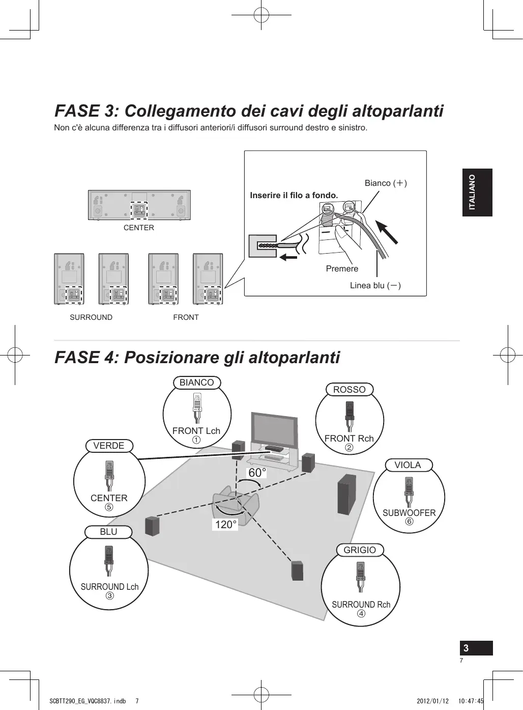 2012/01/12 10:47:45 DEUTSCH FASE 3: Collegamento dei cavi degli altoparlanti ITALIANO Non c'è alcuna differenza tra i diffusori anteriori/i diffusori surround destro e sinistro. Bianco (i) Inserire il filo a fondo. FRANÇAIS CENTER Premere FRONT NEDERLANDS SURROUND ESPAÑOL Linea blu (j) FASE 4: Posizionare gli altoparlanti BIANCO FRONT Lch FRONT Rch