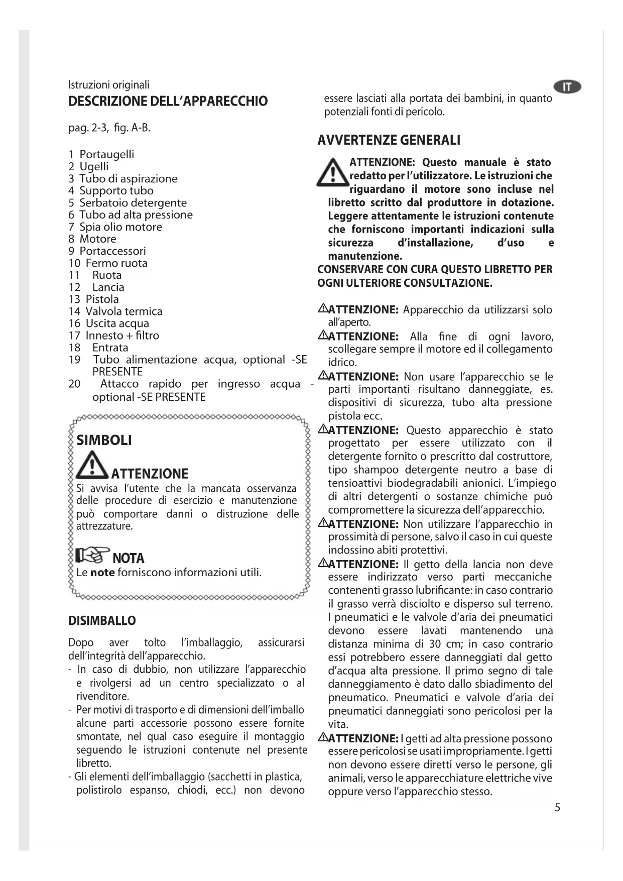 pag. 2-3, fig. A-B. 1 Portaugelli 2 Ugelli 3 Tubo di aspirazione 4 Supporto tubo 5 Serbatoio detergente 6 Tubo ad alta pressione 7 Spia olio motore 8 Motore 9 Portaccessori 10 Fermo ruota 11 Ruota 12 Lancia 13 Pistola 14 Valvola termica 16 Uscita acqua 17 Innesto + filtro 18 Entrata 19 Tubo alimentazione acqua, optional -SE PRESENTE 20 Attacco rapido per ingresso acqua - optional -SE PRESENTE SIMBOLI ATTENZIONE Si avvisa l’utente che la mancata osservanza delle procedure di esercizio e manutenzione può comportare danni o distruzione delle attrezzature. NOTA Le note forniscono informazioni utili. DISIMBALLO Dopo aver tolto l’imballaggio, assicurarsi dell’integrità dell’apparecchio. - In caso di dubbio, non utilizzare l’apparecchio e rivolgersi ad un centro specializzato o al rivenditore. - Per motivi di trasporto e di dimensioni dell’imballo alcune parti accessorie possono essere fornite smontate, nel qual caso eseguire il montaggio seguendo le istruzioni contenute nel presente libretto. - Gli elementi dell’imballaggio (sacchetti in plastica, polistirolo espanso, chiodi, ecc.) non devono essere lasciati alla portata dei bambini, in quanto potenziali fonti di pericolo. AVVERTENZE GENERALI ATTENZIONE: Questo manuale è stato redatto per l’utilizzatore. Le istruzioni che riguardano il motore sono incluse nel libretto scritto dal produttore in dotazione. Leggere attentamente le istruzioni contenute che forniscono importanti indicazioni sulla sicurezza d’installazione, d’uso e manutenzione.