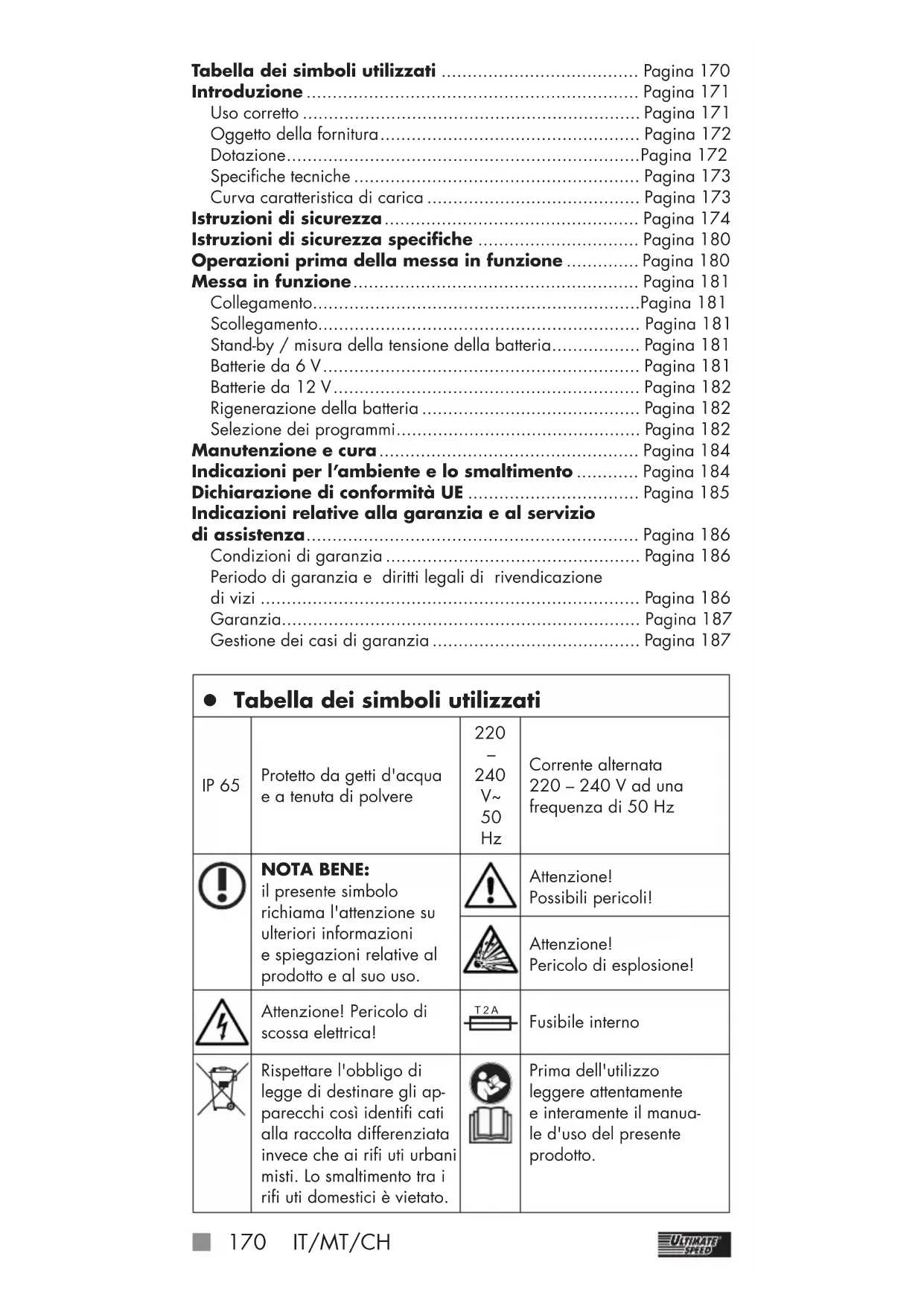 Corrente alternata 220 – 240 V ad una frequenza di 50 Hz NOTA BENE: il presente simbolo richiama l'attenzione su ulteriori informazioni e spiegazioni relative al prodotto e al suo uso. Attenzione! Possibili pericoli! Attenzione! Pericolo di esplosione! Attenzione! Pericolo di scossa elettrica! T 2 A Fusibile interno Rispettare l'obbligo di legge di destinare gli ap- parecchi così identifi cati alla raccolta differenziata invece che ai rifi uti urbani misti. Lo smaltimento tra i rifi uti domestici è vietato. Prima dell'utilizzo leggere attentamente e interamente il manua- le d'uso del presente prodotto. Tabella dei simboli utilizzati ...................................... Pagina 170 Introduzione ................................................................ Pagina 171 Uso corretto ................................................................. Pagina 171 Oggetto della fornitura .................................................. Pagina 172 Dotazione .................................................................... Pagina 172 Specifi che tecniche ....................................................... Pagina 173 Curva caratteristica di carica ......................................... Pagina 173 Istruzioni di sicurezza ................................................. Pagina 174 Istruzioni di sicurezza specifi che ............................... Pagina 180 Operazioni prima della messa in funzione .............. Pagina 180 Messa in funzione ....................................................... Pagina 181 Collegamento ............................................................... Pagina 181 Scollegamento.............................................................. Pagina 181 Stand-by / misura della tensione della batteria ................. Pagina 181 Batterie da 6 V ............................................................. Pagina 181 Batterie da 12 V ........................................................... Pagina 182 Rigenerazione della batteria .......................................... Pagina 182 Selezione dei programmi ............................................... Pagina 182 Manutenzione e cura .................................................. Pagina 184 Indicazioni per l’ambiente e lo smaltimento ............ Pagina 184 Dichiarazione di conformità UE ................................. Pagina 185 Indicazioni relative alla garanzia e al servizio di assistenza ................................................................ Pagina 186 Condizioni di garanzia ................................................. Pagina 186 Periodo di garanzia e diritti legali di rivendicazione divizi ......................................................................... Pagina 186 Garanzia..................................................................... Pagina 187 Gestione dei casi di garanzia ........................................ Pagina 187 497453_2204_Kfz-Ladegerat ULGD 5_0 D2_content_LB8.indb 170497453_2204_Kfz-Ladegerat ULGD 5_0 D2_content_LB8.indb 170 27.06.22 11:1427.06.22 11:14IT/MT/CH