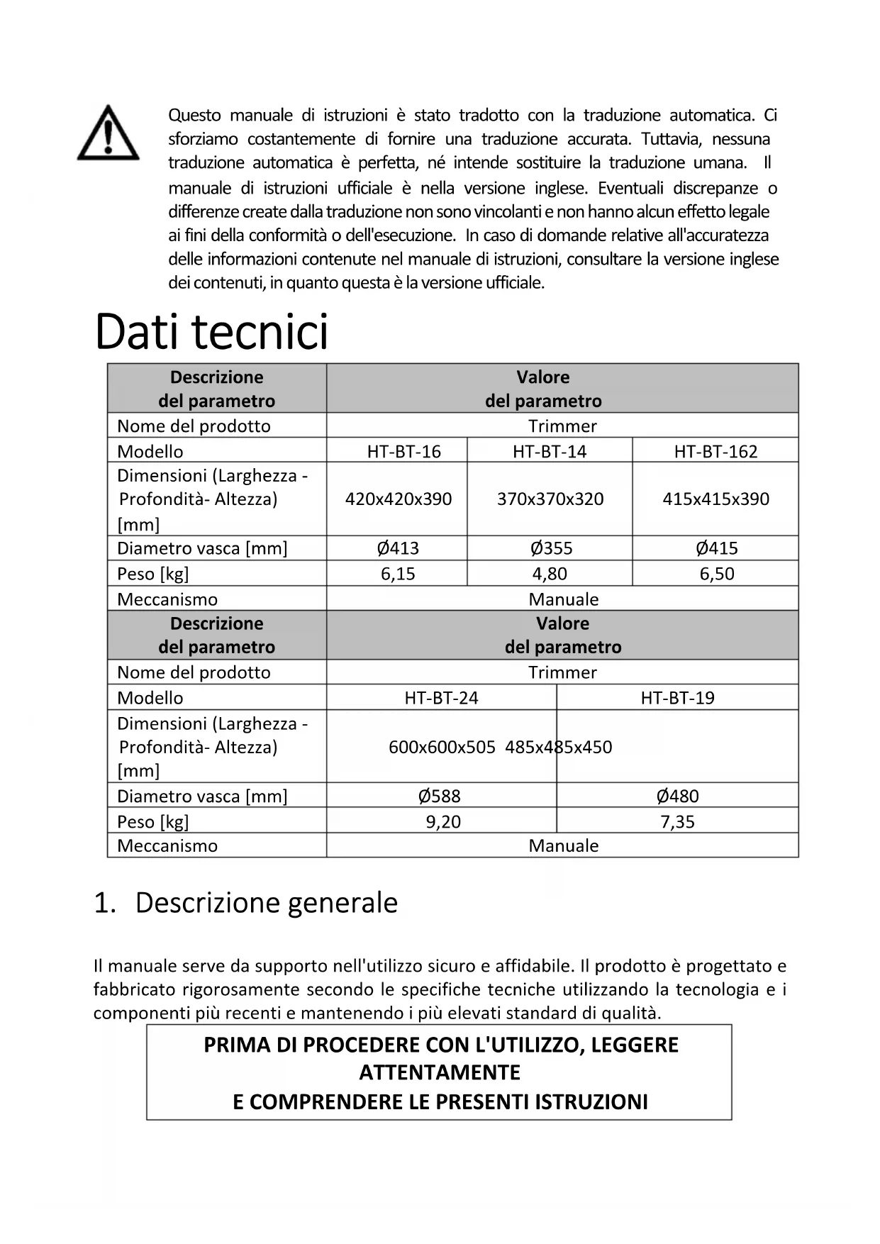 Questo manuale di istruzioni è stato tradotto con la traduzione automatica. Ci sforziamo costantemente di fornire una traduzione accurata. Tuttavia, nessuna traduzione automatica è perfetta, né intende sostituire la traduzione umana. Il manuale di istruzioni ufficiale è nella versione inglese. Eventuali discrepanze o differenze create dalla traduzione non sono vincolanti e non hanno alcun effetto legale ai fini della conformità o dell'esecuzione. In caso di domande relative all'accuratezza delle informazioni contenute nel manuale di istruzioni, consultare la versione inglese dei contenuti, in quanto questa è la versione ufficiale.Per garantire un funzionamento duraturo e affidabile del dispositivo occorre prestare attenzione al suo funzionamento e alla sua manutenzione secondo le istruzioni del presente manuale. I dati tecnici e le specifiche di questo manuale sono aggiornati. Il produttore si riserva il diritto di apportare modifiche per migliorare la qualità. Tenendo conto del progresso tecnologico e della possibilità di ridurre il rumore, l’apparecchio è progettato e costruito in modo tale che il rischio derivante dall'emissione di rumore sia ridotto al livello più basso. Spiegazione dei simboli