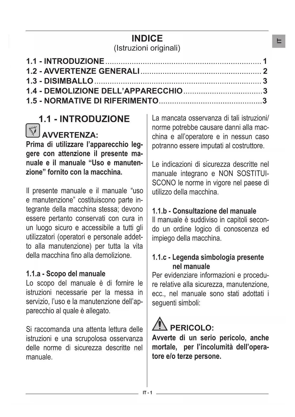 nel manuale Per evidenziare informazioni e procedu- re relative alla sicurezza, manutenzione, ecc., nel manuale sono stati adottati i seguenti simboli: PERICOLO: Avverte di un serio pericolo, anche mortale, per l’incolumità dell’opera- tore e/o terze persone. INDICE (Istruzioni originali)