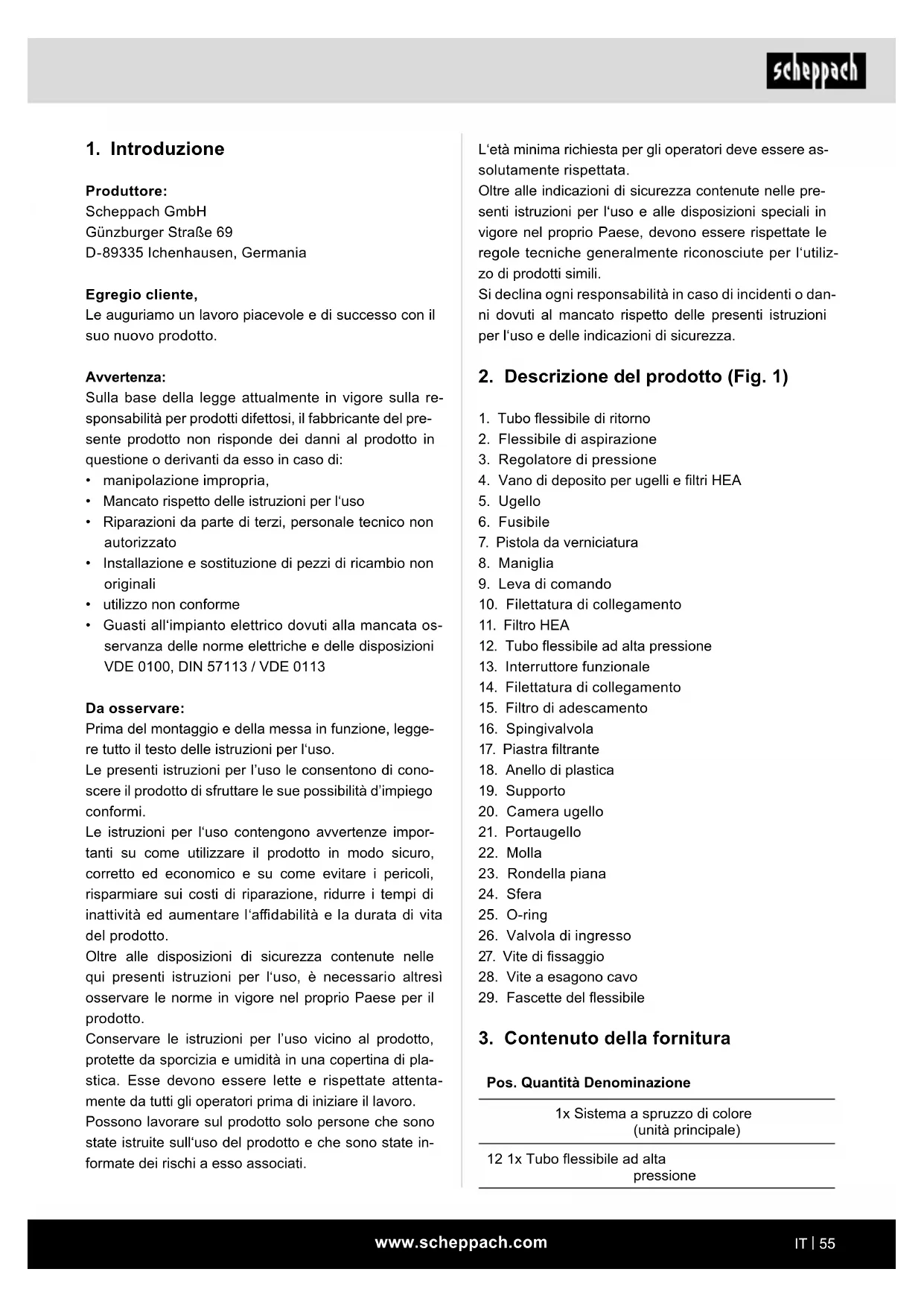 Produttore: Scheppach GmbH Günzburger Straße 69 D-89335 Ichenhausen, Germania Egregio cliente, Le auguriamo un lavoro piacevole e di successo con il suo nuovo prodotto. Avvertenza: Sulla base della legge attualmente in vigore sulla re- sponsabilità per prodotti difettosi, il fabbricante del pre- sente prodotto non risponde dei danni al prodotto in questione o derivanti da esso in caso di: