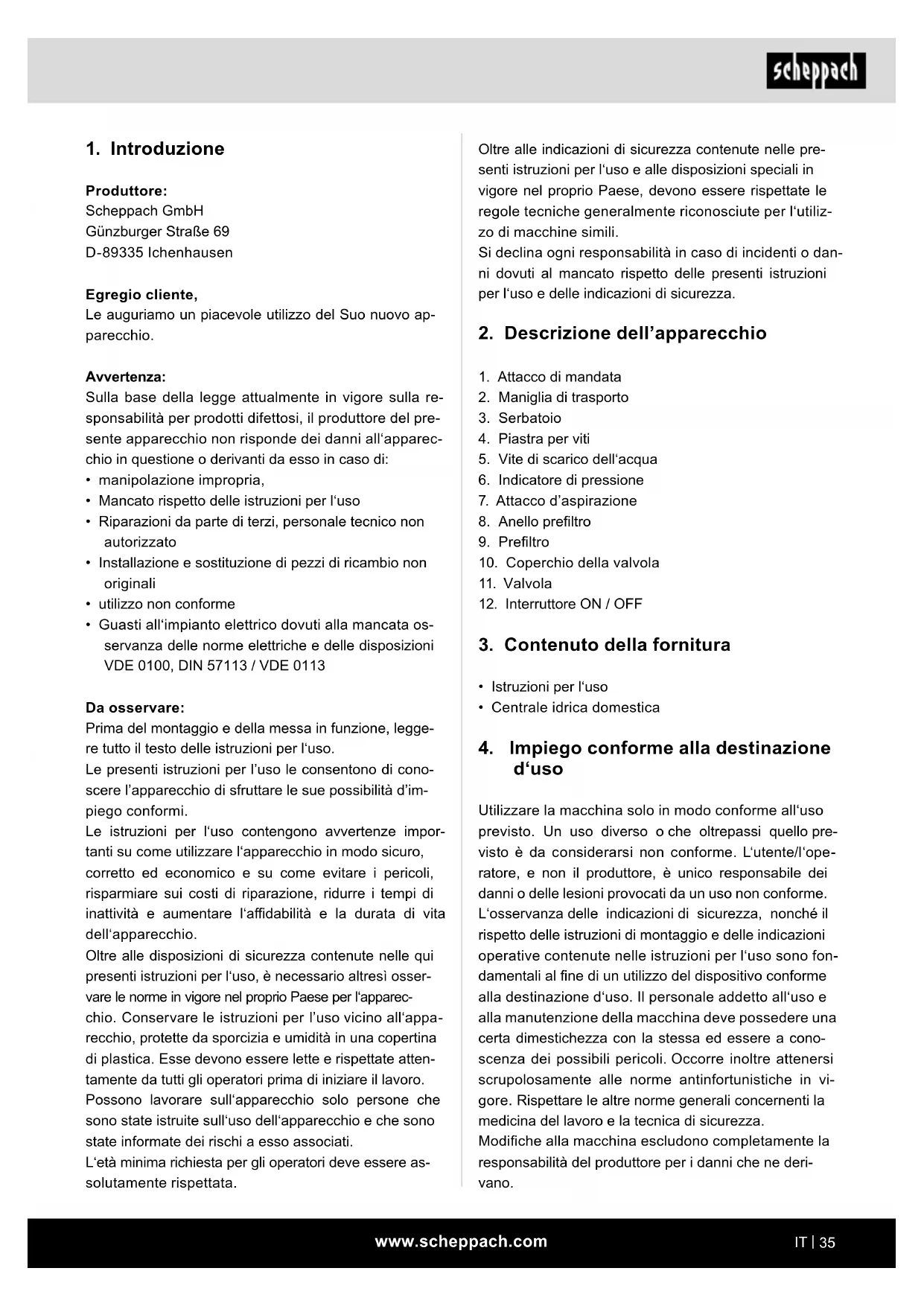 - Prima della messa in funzione, fare vericare da esperto la presenza delle adeguate misure di pro- tezione elettrica. m Avviso! In presenza di acqua stagnante, laghetti da giardino e laghetti balneabili e nelle loro vicinan- ze, l’uso della pompa è consentito solo con un inter- ruttore di protezione con una corrente residua nomi- nale di intervento no a 30 mA (secondo VDE 0100 parte 702 e 738).www.scheppach.com