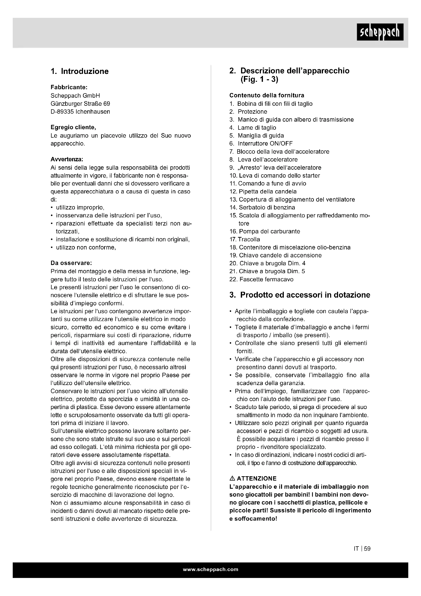 m ATTENZIONE L’apparecchio e il materiale di imballaggio non sono giocattoli per bambini! I bambini non devo- no giocare con i sacchetti di plastica, pellicole e piccole parti! Sussiste il pericolo di ingerimento e soocamento!www.scheppach.com