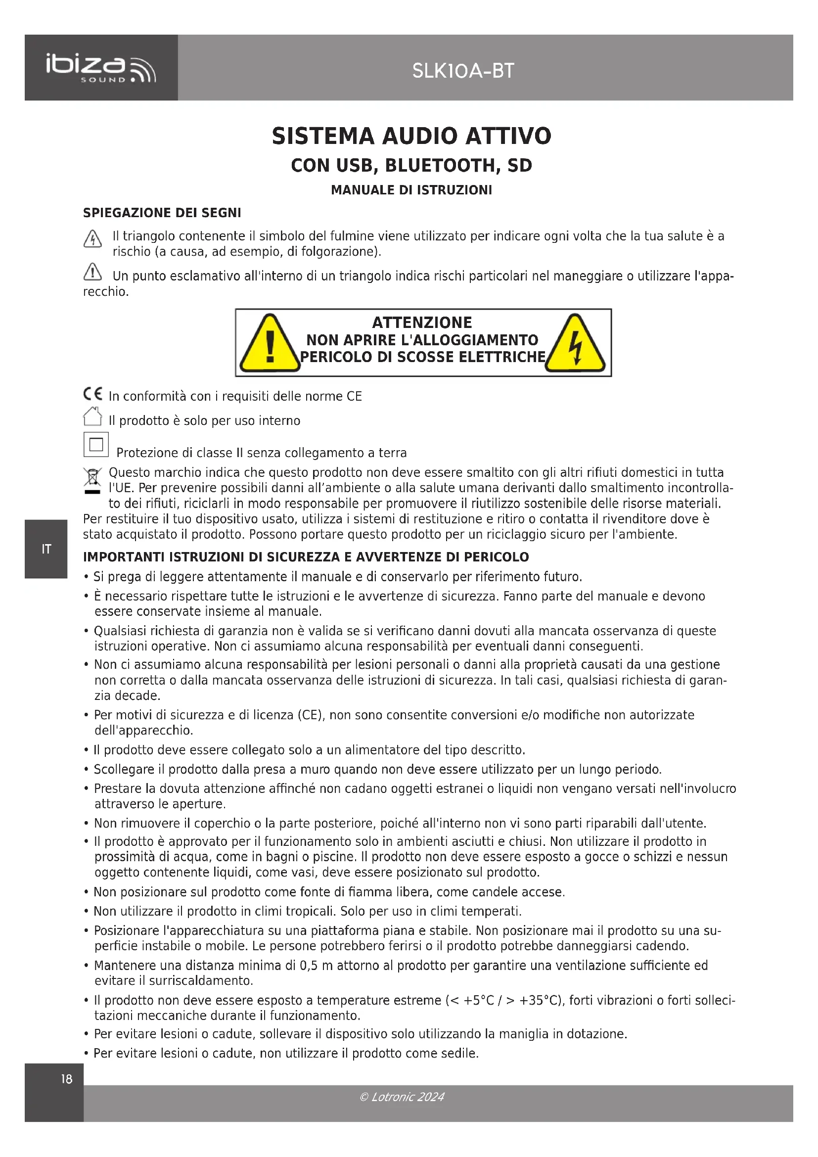 Scarica le istruzioni per il tuo Altoparlante in formato PDF gratuitamente! Trova il tuo manuale SLK10ABT - IBIZA SOUND e riprendi in mano il tuo dispositivo elettronico. In questa pagina sono pubblicati tutti i documenti necessari per l'utilizzo del tuo dispositivo. SLK10ABT del marchio IBIZA SOUND.