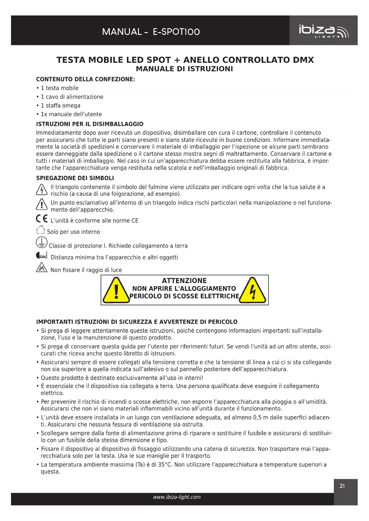 Scarica le istruzioni per il tuo Lampada in formato PDF gratuitamente! Trova il tuo manuale ESPOT100 - IBIZA SOUND e riprendi in mano il tuo dispositivo elettronico. In questa pagina sono pubblicati tutti i documenti necessari per l'utilizzo del tuo dispositivo. ESPOT100 del marchio IBIZA SOUND.