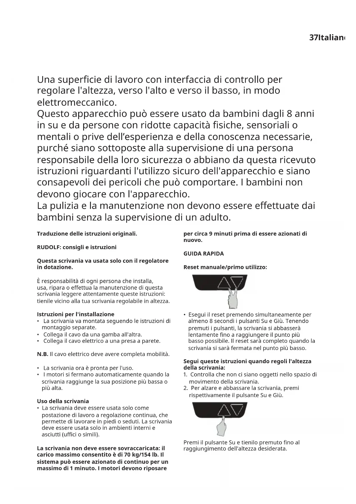 - La scrivania deve essere usata solo come postazione di lavoro a regolazione continua, che permette di lavorare in piedi o seduti. La scrivania deve essere usata solo in ambienti interni e asciutti (uci o simili). Lascrivanianondeveesseresovraccaricata:il caricomassimoconsentitoèdi70kg/154lb.Il sistemapuòessereazionatodicontinuoperun massimo di 1 minuto. I motori devono riposare percirca9minutiprimadiessereazionatidi nuovo. GUIDA RAPIDA Resetmanuale/primoutilizzo: