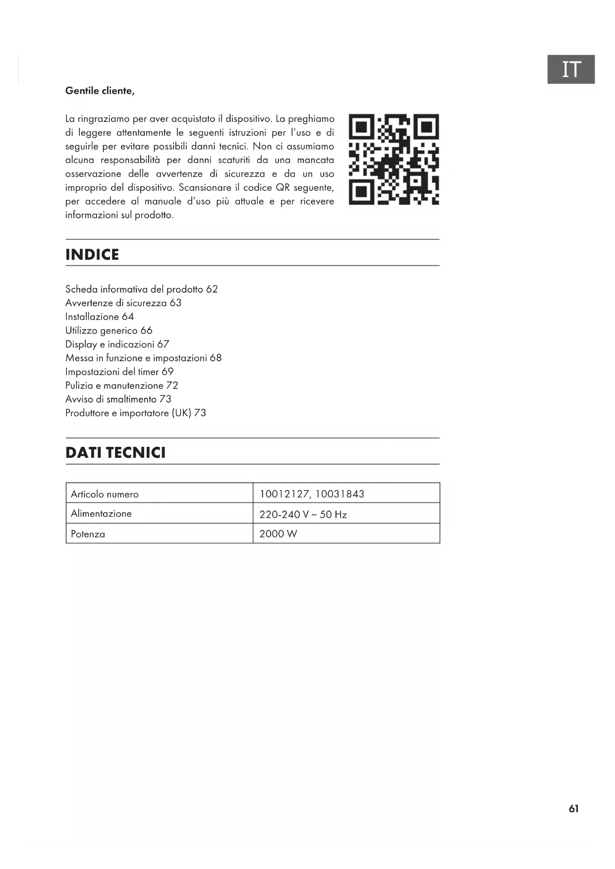 Gentile cliente, La ringraziamo per aver acquistato il dispositivo. La preghiamo di leggere attentamente le seguenti istruzioni per l’uso e di seguirle per evitare possibili danni tecnici. Non ci assumiamo alcuna responsabilità per danni scaturiti da una mancata osservazione delle avvertenze di sicurezza e da un uso improprio del dispositivo. Scansionare il codice QR seguente, per accedere al manuale d’uso più attuale e per ricevere informazioni sul prodotto. INDICE Scheda informativa del prodotto62 Avvertenze di sicurezza63 Installazione64 Utilizzo generico66 Display e indicazioni67 Messa in funzione e impostazioni68 Impostazioni del timer69 Pulizia e manutenzione72 Avviso di smaltimento73 Produttore e importatore (UK)73 DATI TECNICI Articolo numero 10012127, 10031843 Alimentazione 220-240 V ~ 50 Hz Potenza 2000 W62
