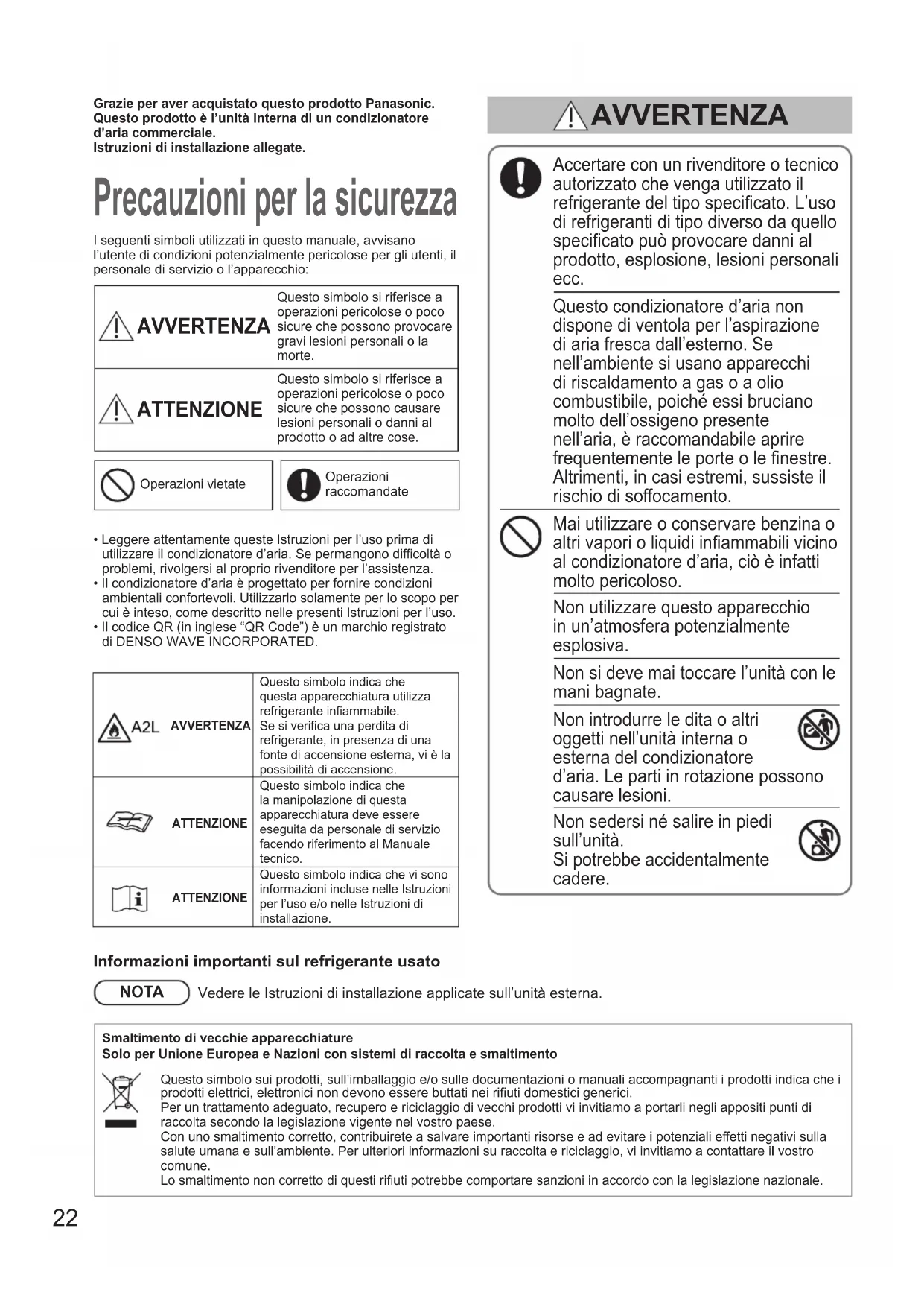 Im Falle eines Stromausfalls bei laufender Einheit Die Einheit nimmt den Betrieb automatisch wieder auf. Die Einstellungen für den Betrieb, die vor dem Stromausfall vorlagen, werden wieder vorgegeben. ZUR BEACHTUNG In dieser Klimaanlage ist ein Biozidprodukt integriert.Freie Radikale, die von einem in der Klimaanlage integrierten Gerät generiert werden, haben die Fähigkeit, Verunreinigungen wie bestimmte Arten von Bakterien, Viren und Schimmel zu hemmen.Wirkstoe: aus der Umgebungsluft oder Wasser in situ generierte freie RadikaleVerwendung: Diese Gerätefunktion kann mit der Symboltaste „nanoe X“ ein- und ausgeschaltet werden, bzw. mit den Fernbedienungseinstellungen, wenn keine Symboltaste „nanoe X“ vorhanden ist. Weitere Einzelheiten nden Sie unter „Verwendung“. Scannen Sie den QR-Code auf der Vorderseite und lesen Sie die ausführliche Gebrauchsanweisung. Arbeitsweise 00_360661_all.indb 2100_360661_all.indb 21 2024/10/07 17:19:322024/10/07 17:19:3222 Grazie per aver acquistato questo prodotto Panasonic.Questo prodotto è l’unità interna di un condizionatore d’aria commerciale.Istruzioni di installazione allegate. AVVERTENZA Precauzioni per la sicurezza I seguenti simboli utilizzati in questo manuale, avvisano l’utente di condizioni potenzialmente pericolose per gli utenti, il personale di servizio o l’apparecchio: AVVERTENZA Questo simbolo si riferisce a operazioni pericolose o poco sicure che possono provocare gravi lesioni personali o la morte. ATTENZIONE Questo simbolo si riferisce a operazioni pericolose o poco sicure che possono causare lesioni personali o danni al prodotto o ad altre cose.Operazioni vietateOperazioni raccomandateInformazioni importanti sul refrigerante usato NOTA Vedere le Istruzioni di installazione applicate sull’unità esterna.Smaltimento di vecchie apparecchiatureSolo per Unione Europea e Nazioni con sistemi di raccolta e smaltimento Questo simbolo sui prodotti, sull’imballaggio e/o sulle documentazioni o manuali accompagnanti i prodotti indica che i prodotti elettrici, elettronici non devono essere buttati nei riuti domestici generici.Per un trattamento adeguato, recupero e riciclaggio di vecchi prodotti vi invitiamo a portarli negli appositi punti di raccolta secondo la legislazione vigente nel vostro paese. Con uno smaltimento corretto, contribuirete a salvare importanti risorse e ad evitare i potenziali eetti negativi sulla salute umana e sull’ambiente. Per ulteriori informazioni su raccolta e riciclaggio, vi invitiamo a contattare il vostro comune. Lo smaltimento non corretto di questi riuti potrebbe comportare sanzioni in accordo con la legislazione nazionale. • Leggere attentamente queste Istruzioni per l’uso prima di utilizzare il condizionatore d’aria. Se permangono dicoltà o problemi, rivolgersi al proprio rivenditore per l’assistenza.• Il condizionatore d’aria è progettato per fornire condizioni ambientali confortevoli. Utilizzarlo solamente per lo scopo per cui è inteso, come descritto nelle presenti Istruzioni per l’uso.• Il codice QR (in inglese “QR Code”) è un marchio registrato di DENSO WAVE INCORPORATED.AVVERTENZAQuesto simbolo indica che questa apparecchiatura utilizza refrigerante infiammabile. Se si verifica una perdita di refrigerante, in presenza di una fonte di accensione esterna, vi è la possibilità di accensione.ATTENZIONEQuesto simbolo indica che la manipolazione di questa apparecchiatura deve essere eseguita da personale di servizio facendo riferimento al Manuale tecnico.ATTENZIONEQuesto simbolo indica che vi sono informazioni incluse nelle Istruzioni per l’uso e/o nelle Istruzioni di installazione. Accertare con un rivenditore o tecnico autorizzato che venga utilizzato il refrigerante del tipo specicato. L’uso di refrigeranti di tipo diverso da quello specicato può provocare danni al prodotto, esplosione, lesioni personali ecc. Questo condizionatore d’aria non dispone di ventola per l’aspirazione di aria fresca dall’esterno. Se nell’ambiente si usano apparecchi di riscaldamento a gas o a olio combustibile, poiché essi bruciano molto dell’ossigeno presente nell’aria, è raccomandabile aprire frequentemente le porte o le nestre. Altrimenti, in casi estremi, sussiste il rischio di soocamento. Mai utilizzare o conservare benzina o altri vapori o liquidi inammabili vicino al condizionatore d’aria, ciò è infatti molto pericoloso. Non utilizzare questo apparecchio in un’atmosfera potenzialmente esplosiva. Non si deve mai toccare l’unità con le mani bagnate. Non introdurre le dita o altri oggetti nell’unità interna o esterna del condizionatore d’aria. Le parti in rotazione possono causare lesioni. Non sedersi né salire in piedi sull’unità. Si potrebbe accidentalmente cadere. 00_360661_all.indb 2200_360661_all.indb 22 2024/10/07 17:19:322024/10/07 17:19:3223 ITALIANO Se il refrigerante entra in contatto con una amma, produce gas tossici. Per motivi di sicurezza, prima di procedere con la pulizia o la manutenzione, spegnere il condizionatore d’aria e scollegarlo dall’alimentazione elettrica. Scollegare la spia di alimentazione dalla presa, oppure spegnere l’interruttore dierenziale o disinserire l’alimentazione spegnendo il sezionatore, in modo da isolare il condizionatore d’aria dall’alimentazione di rete in caso di emergenza. Smaltire in conformità con le normative nazionali e/o locali. Questo prodotto non deve essere modicato o smontato in nessun caso. L’unità modicata o smontata può causare incendio, scosse elettriche o lesioni personali. Non pulire da sé l’interno delle unità interne ed esterne. Tale pulizia deve essere adata a un rivenditore o a un tecnico autorizzato. In caso di malfunzionamento dell’apparecchio, non tentare di ripararlo da sé. Per le riparazioni e lo smaltimento, rivolgersi al proprio rivenditore o a un centro di assistenza. Collegare ciascuna unità a una presa di corrente dedicata e nella linea esclu