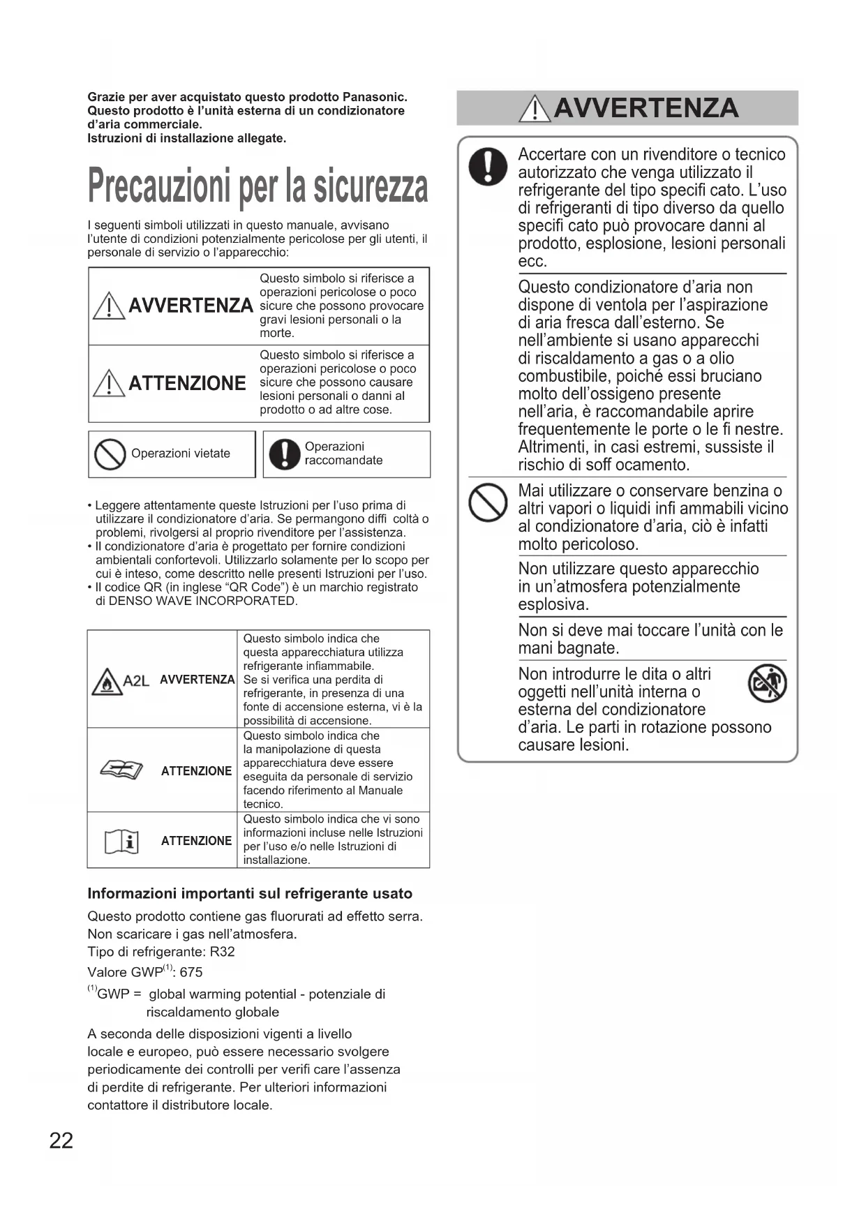 Fehlerbehebung Lesen Sie die mit dem Innengerät gelieferte Bedienungsanleitung. 00360620all.indb2100360620all.indb21 2024/06/249:31:352024/06/249:31:3522 Grazie per aver acquistato questo prodotto Panasonic.Questo prodotto è l’unità esterna di un condizionatore d’aria commerciale.Istruzioni di installazione allegate. Accertare con un rivenditore o tecnico autorizzato che venga utilizzato il refrigerante del tipo specifi cato. L’uso di refrigeranti di tipo diverso da quello specifi cato può provocare danni al prodotto, esplosione, lesioni personali ecc. Questo condizionatore d’aria non dispone di ventola per l’aspirazione di aria fresca dall’esterno. Se nell’ambiente si usano apparecchi di riscaldamento a gas o a olio combustibile, poiché essi bruciano molto dell’ossigeno presente nell’aria, è raccomandabile aprire frequentemente le porte o le fi nestre. Altrimenti, in casi estremi, sussiste il rischio di soff ocamento. Mai utilizzare o conservare benzina o altri vapori o liquidi infi ammabili vicino al condizionatore d’aria, ciò è infatti molto pericoloso. Non utilizzare questo apparecchio in un’atmosfera potenzialmente esplosiva. Non si deve mai toccare l’unità con le mani bagnate. Non introdurre le dita o altri oggetti nell’unità interna o esterna del condizionatore d’aria. Le parti in rotazione possono causare lesioni. AVVERTENZA Precauzioni per la sicurezza I seguenti simboli utilizzati in questo manuale, avvisano l’utente di condizioni potenzialmente pericolose per gli utenti, il personale di servizio o l’apparecchio: AVVERTENZA Questo simbolo si riferisce a operazioni pericolose o poco sicure che possono provocare gravi lesioni personali o la morte. ATTENZIONE Questo simbolo si riferisce a operazioni pericolose o poco sicure che possono causare lesioni personali o danni al prodotto o ad altre cose.Operazioni vietateOperazioniraccomandate• Leggere attentamente queste Istruzioni per l’uso prima di utilizzare il condizionatore d’aria. Se permangono diffi coltà o problemi, rivolgersi al proprio rivenditore per l’assistenza.• Il condizionatore d’aria è progettato per fornire condizioni ambientali confortevoli. Utilizzarlo solamente per lo scopo per cui è inteso, come descritto nelle presenti Istruzioni per l’uso.• Il codice QR (in inglese “QR Code”) è un marchio registrato di DENSO WAVE INCORPORATED.AVVERTENZAQuesto simbolo indica che questa apparecchiatura utilizza refrigerante infiammabile. Se si verifica una perdita di refrigerante, in presenza di una fonte di accensione esterna, vi è la possibilità di accensione.ATTENZIONEQuesto simbolo indica che la manipolazione di questa apparecchiatura deve essere eseguita da personale di servizio facendo riferimento al Manuale tecnico.ATTENZIONEQuesto simbolo indica che vi sono informazioni incluse nelle Istruzioni per l’uso e/o nelle Istruzioni di installazione.Informazioni importanti sul refrigerante usato Questo prodotto contiene gas fl uorurati ad eff etto serra. Non scaricare i gas nell’atmosfera.Tipo di refrigerante: R32Valore GWP (1) : 675 (1) GWP = global warming potential - potenziale di riscaldamento globale A seconda delle disposizioni vigenti a livello locale e europeo, può essere necessario svolgere periodicamente dei controlli per verifi care l’assenza di perdite di refrigerante. Per ulteriori informazioni contattore il distributore locale. 00360620all.indb2200360620all.indb22 2024/06/249:31:352024/06/249:31:3523 ITALIANO Se il refrigerante entra in contatto con una fi amma, produce gas tossici. Per motivi di sicurezza, prima di procedere con la pulizia o la manutenzione, spegnere il condizionatore d’aria e scollegarlo dall’alimentazione elettrica. Scollegare la spia di alimentazione dalla presa, oppure spegnere l’interruttore diff erenziale o disinserire l’alimentazione spegnendo il sezionatore, in modo da isolare il condizionatore d’aria dall’alimentazione di rete in caso di emergenza. Smaltire in conformità con le normative nazionali e/o locali. Questo prodotto non deve essere modifi cato o smontato in nessun caso. L’unità modifi cata o smontata può causare incendio, scosse elettriche o lesioni personali. Non pulire da sé l’interno delle unità interne ed esterne. Tale pulizia deve essere affi data a un rivenditore o a un tecnico autorizzato. In caso di malfunzionamento dell’apparecchio, non tentare di ripararlo da sé. Per le riparazioni e lo smaltimento, rivolgersi al proprio rivenditore o a un centro di assistenza. Collegare ciascuna unità a una presa di corrente dedicata e nella linea esclusiva installare un sezionatore, un interruttore diff erenziale contro le perdite a terra (ELCB) o un interruttore diff erenziale (RCD) per la protezione da sovracorrente. Collegare ciascuna unità a una presa elettrica dedicata e con i cablaggi fi ssi provvisti della possibilità di scollegare totalmente l’alimentazione mediante separazione di tutti i poli in ottemperanza alle normative sui collegamenti elettrici. Per evitare i rischi derivanti da eventuali problemi di isolamento, l’unità deve essere collegata a massa. AVVERTENZA Per prevenire surriscaldamento e incendio, non utilizzare cavi modifi cati, cavi di giunzione, prolunghe o cavi non specifi cati. L’apparecchio deve essere conservato in un locale in cui non siano presenti fonti di accensione con funzionamento continuo (come ad esempio fi amme libere, apparecchi a gas in funzione o riscaldatori elettrici in funzione). Tenere presente che i refrigeranti possono essere inodore. Se l’apparecchio è installato in un’area non ventilata, tale area deve essere predisposta in modo che, in caso di perdite di refrigerante, questo non possa ristagnare creando pericolo di incendio o di esplosione. L’apparecchio deve essere conservato in un locale di dimensioni corrispondenti a quelle richieste per il locale d’uso. Dopo aver installato l’unità, non mancare mai di chiedere all’