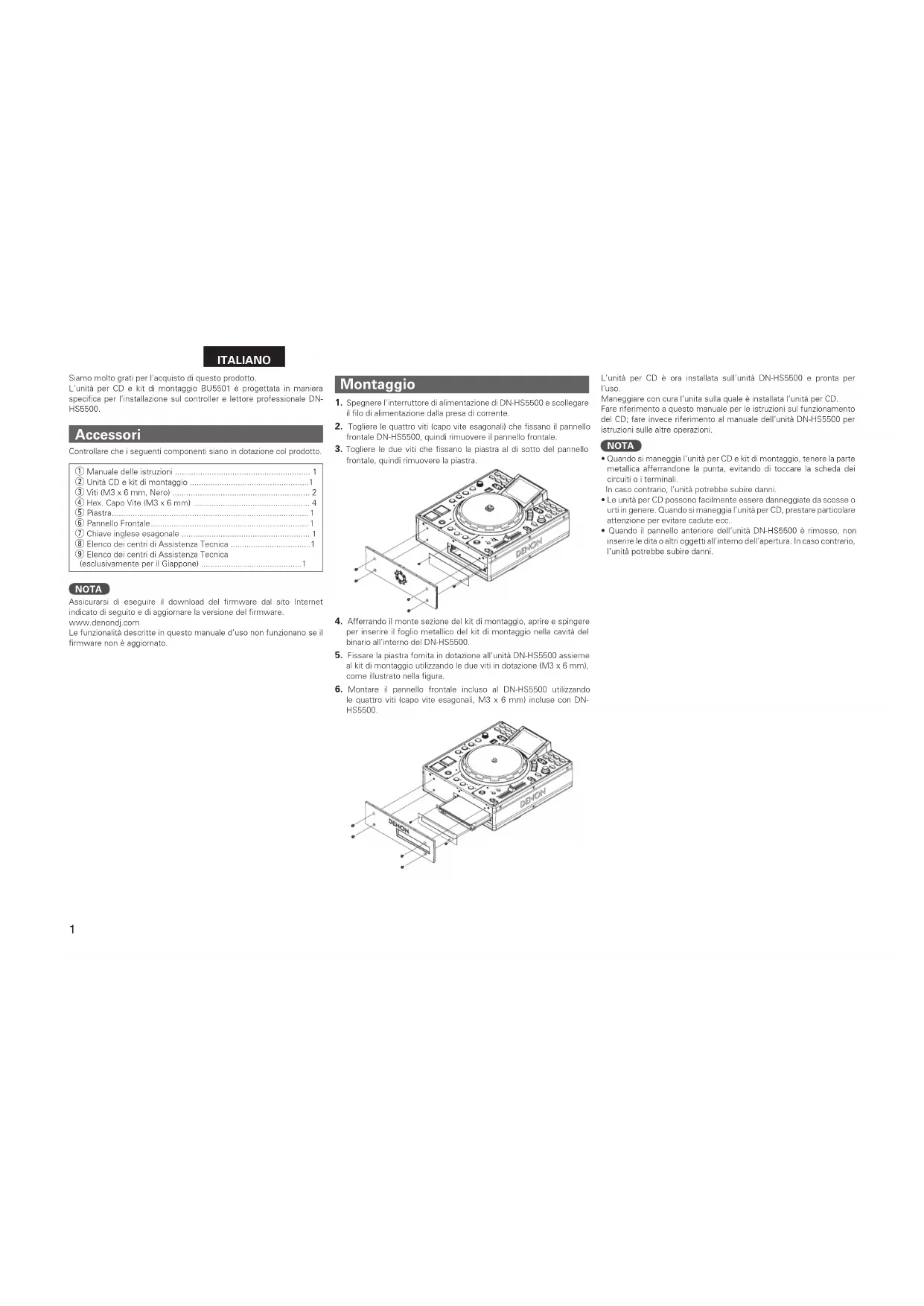 le quattro viti (capo vite esagonali, M3 x 6 mm) incluse con DN- HS5500. L’unità per CD è ora installata sull’unità DN-HS5500 e pronta per l’uso. Maneggiare con cura l’unita sulla quale è installata l’unità per CD. Fare riferimento a questo manuale per le istruzioni sul funzionamento del CD; fare invece riferimento al manuale dell’unità DN-HS5500 per istruzioni sulle altre operazioni. NOTA