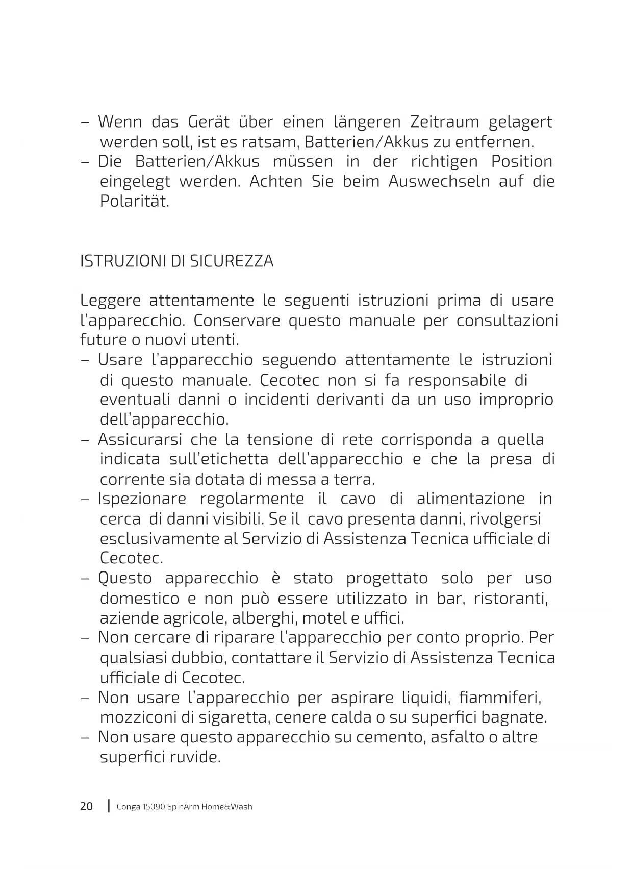 Leggere attentamente le seguenti istruzioni prima di usare l’apparecchio. Conservare questo manuale per consultazioni future o nuovi utenti. – Usare l’apparecchio seguendo attentamente le istruzioni di questo manuale. Cecotec non si fa responsabile di eventuali danni o incidenti derivanti da un uso improprio dell’apparecchio. – Assicurarsi che la tensione di rete corrisponda a quella indicata sull’etichetta dell’apparecchio e che la presa di corrente sia dotata di messa a terra. – Ispezionare regolarmente il cavo di alimentazione in cerca di danni visibili. Se il cavo presenta danni, rivolgersi esclusivamente al Servizio di Assistenza Tecnica uciale di Cecotec. – Questo apparecchio è stato progettato solo per uso domestico e non può essere utilizzato in bar, ristoranti, aziende agricole, alberghi, motel e uci. – Non cercare di riparare l’apparecchio per conto proprio. Per qualsiasi dubbio, contattare il Servizio di Assistenza Tecnica uciale di Cecotec. – Non usare l’apparecchio per aspirare liquidi, ammiferi, mozziconi di sigaretta, cenere calda o su superci bagnate. – Non usare questo apparecchio su cemento, asfalto o altre superci ruvide.21 Conga 15090 SpinArm Home&Wash – Smettere di usare l’apparecchio se si nota un suono anomalo o una temperatura più alta del normale. – Non bloccare le aperture dell’apparecchio né ostruire il usso dell’aria. Tenere le aperture libere da oggetti e non bloccarle con vestiti o dita. – Spegnere e scollegare l’apparecchio dall’alimentazione quando non viene utilizzato per un certo periodo di tempo, prima di pulirlo, prima di montare o smontare i componenti e prima di rimuovere la batteria. Togliere la spina per scollegare l’apparecchio, non tirare il cavo. – ATTENZIONE: l’apparecchio si compone di parti rotanti che possono impigliarsi. Usare la massima cautela. – Non sommergere il cavo, la spina o qualsiasi altra parte dell’apparecchio in acqua o all’interno di qualsiasi altro liquido, né esporre i componenti elettrici all’acqua. Vericare di avere le mani completamente asciutte prima di toccare la presa o accendere l’apparecchio. – Questo apparecchio può essere usato da bambini a partire da 8 anni e da persone con ridotte capacità siche, sensoriali o mentali o con mancanza di esperienza e conoscenza, a condizione che siano supervisionati o istruiti sull’uso dell’apparecchio in modo sicuro e che comprendano i pericoli che questo presenta. I bambini non devono giocare con l’apparecchio. La pulizia e la manutenzione non devono essere eettuate da bambini non sorvegliati. – Scollegare la spina del cavo di alimentazione prima di qualsiasi operazione di pulizia o manutenzione. – L’apparecchio deve essere usato solo con l’alimentatore fornito. – L’apparecchio deve essere alimentato a una tensione di sicurezza molto bassa come indicato sull’apparecchio stesso.22 Conga 15090 SpinArm Home&Wash – Non toccare la spina né la presa di corrente con le mani bagnate. – Non esporre l’apparecchio alla luce diretta del sole, fuoco, acqua o umidità. – Non sedersi o appoggiare oggetti appuntiti o pesanti sull’apparecchio. – Prima di mettere in funzione il robot aspirapolvere, preparare la stanza e fare attenzione a rimuovere oggetti e cavi che possano inuire sul suo funzionamento. – Mantenere l’apparecchio lontano da indumenti, tende e materiali simili. – Collocare l’apparecchio su di una supercie piana e stabile. Evitare di collocarlo su superci instabili da cui potrebbe cadere (ad esempio su tavoli o sedie). – Prima di mettere in funzione il robot aspirapolvere, vericare che tutti i collegamenti, sia sul robot aspirapolvere che sulla base autopulente, siano in buone condizioni. – Evitare di mettere il robot aspirapolvere in funzione a temperature estremamente alte o basse. – L’apparecchio deve essere utilizzato solo con la batteria fornita o con una unità di ricarica compatibile approvata da Cecotec. – Le batterie non ricaricabili non devono essere ricaricate. – Prima di procedere alla pulizia o alla manutenzione, accertarsi che l’apparecchio non sia collegato a una presa di corrente. – Prima di procedere alla pulizia, accertarsi che la base autopulente non sia collegata a una presa di corrente. Istruzioni relative alla batteria – L’apparecchio viene fornito con una batteria agli ioni di litio; non bruciarla né esporla ad alte temperature, poiché potrebbe esplodere.23 Conga 15090 SpinArm Home&Wash – Le batterie possono presentare fughe in condizioni estreme. Se la batteria perde, non toccare il liquido. Se il liquido entra in contatto con la pelle, lavare immediatamente con acqua e sapone. Se il liquido entra in contatto con gli occhi, sciacquare immediatamente gli occhi con abbondante acqua pulita per almeno 10 minuti e consultare un medico. Indossare i guanti quando si maneggia la batteria e smaltirla immediatamente in conformità con le normative locali. – Evitare il contatto tra le batterie e piccoli oggetti metallici come graette, monete, chiavi, chiodi o viti. – Non alterare la batteria in alcun modo. – Le batterie devono essere rimosse dall’apparecchio per uno smaltimento sicuro. – Tenere le batterie che rischiano di essere ingerite fuori dalla portata dei bambini. – L’ingestione di batterie può causare ustioni, perforazione dei tessuti molli e morte. Le pile possono causare gravi ustioni entro due ore dall’ingestione. – In caso di ingestione delle batterie, rivolgersi immediatamente a un medico. – ATTENZIONE: per ricaricare la batteria, utilizzare esclusivamente la base autopulente fornita con l’apparecchio. – I terminali di alimentazione delle batterie non devono essere cortocircuitati. – Se l’apparecchio deve essere conservato per un lungo periodo di tempo, è consigliabile rimuovere le batterie. – Le batterie devono essere inserite nella posizione corretta. Fare attenzione alla polarità quando si sos
