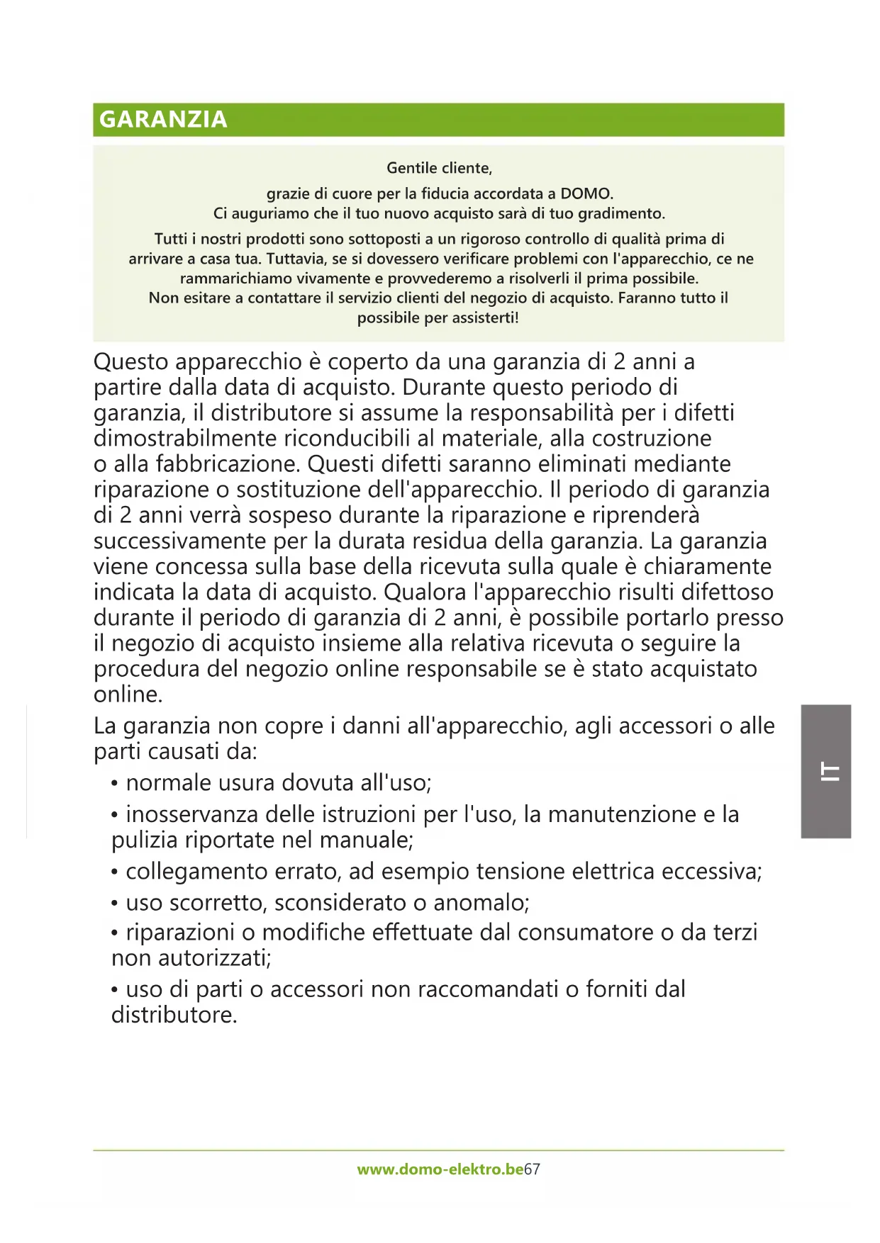 GARANZIA Gentile cliente, grazie di cuore per la ducia accordata a DOMO. Ci auguriamo che il tuo nuovo acquisto sarà di tuo gradimento. Tutti i nostri prodotti sono sottoposti a un rigoroso controllo di qualità prima di arrivare a casa tua. Tuttavia, se si dovessero vericare problemi con l'apparecchio, ce ne rammarichiamo vivamente e provvederemo a risolverli il prima possibile. Non esitare a contattare il servizio clienti del negozio di acquisto. Faranno tutto il possibile per assisterti! Questo apparecchio è coperto da una garanzia di 2 anni a partire dalla data di acquisto. Durante questo periodo di garanzia, il distributore si assume la responsabilità per i difetti dimostrabilmente riconducibili al materiale, alla costruzione o alla fabbricazione. Questi difetti saranno eliminati mediante riparazione o sostituzione dell'apparecchio. Il periodo di garanzia di 2 anni verrà sospeso durante la riparazione e riprenderà successivamente per la durata residua della garanzia. La garanzia viene concessa sulla base della ricevuta sulla quale è chiaramente indicata la data di acquisto. Qualora l'apparecchio risulti difettoso durante il periodo di garanzia di 2 anni, è possibile portarlo presso il negozio di acquisto insieme alla relativa ricevuta o seguire la procedura del negozio online responsabile se è stato acquistato online. La garanzia non copre i danni all'apparecchio, agli accessori o alle parti causati da: