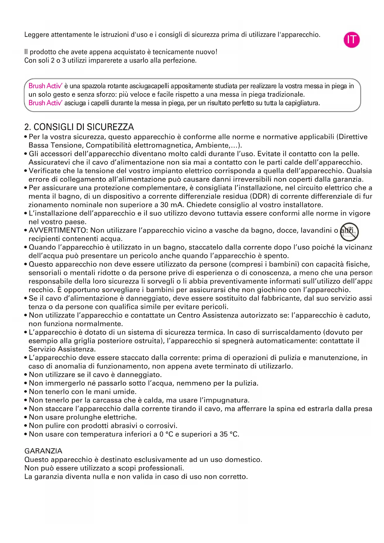 CF9250_1800123013_A5 18/05/11 11:02 Page10Leggere attentamente le istruzioni d'uso e i consigli di sicurezza prima di utilizzare l'apparecchio. Il prodotto che avete appena acquistato è tecnicamente nuovo! Con soli 2 o 3 utilizzi imparerete a usarlo alla perfezione. Brush Activ’ è una spazzola rotante asciugacapelli appositamente studiata per realizzare la vostra messa in piega in un solo gesto e senza sforzo: più veloce e facile rispetto a una messa in piega tradizionale. Brush Activ’ asciuga i capelli durante la messa in piega, per un risultato perfetto su tutta la capigliatura.