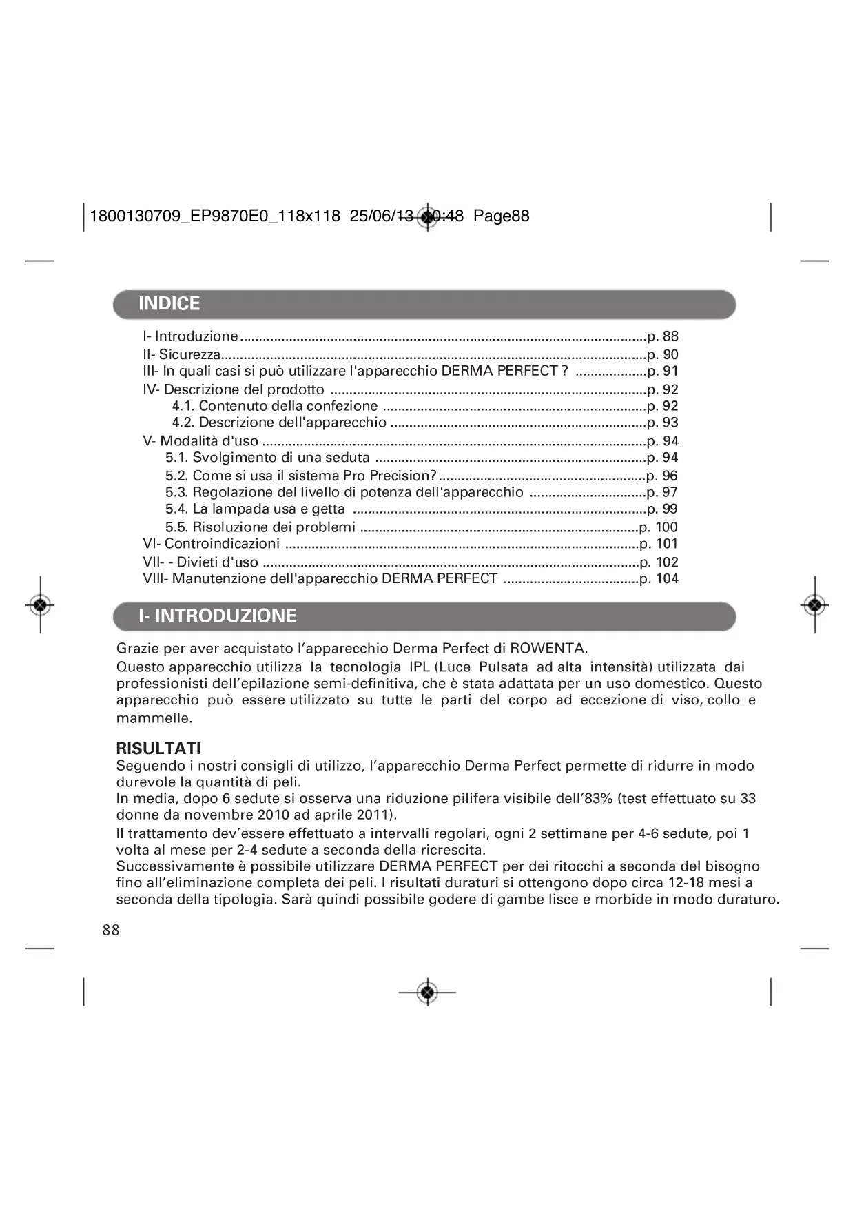 1800130709_EP9870E0_118x118 25/06/13 10:48 Page87I- Introduzione............................................................................................................p. 88 II- Sicurezza.................................................................................................................p. 90 III- In quali casi si può utilizzare l'apparecchio DERMA PERFECT ? ...................p. 91 IV- Descrizione del prodotto ....................................................................................p. 92 4.1. Contenuto della confezione ......................................................................p. 92 4.2. Descrizione dell'apparecchio ....................................................................p. 93 V- Modalità d'uso ......................................................................................................p. 94 5.1. Svolgimento di una seduta ........................................................................p. 94 5.2. Come si usa il sistema Pro Precision?.......................................................p. 96 5.3. Regolazione del livello di potenza dell'apparecchio ...............................p. 97 5.4. La lampada usa e getta ..............................................................................p. 99 5.5. Risoluzione dei problemi ..........................................................................p. 100 VI- Controindicazioni ..............................................................................................p. 101 VII- - Divieti d'uso ....................................................................................................p. 102 VIII- Manutenzione dell'apparecchio DERMA PERFECT ....................................p. 104 Grazie per aver acquistato l’apparecchio Derma Perfect di ROWENTA. Questo apparecchio utilizza la tecnologia IPL (Luce Pulsata ad alta intensità) utilizzata dai professionisti dell’epilazione semi-definitiva, che è stata adattata per un uso domestico. Questo apparecchio può essere utilizzato su tutte le parti del corpo ad eccezione di viso, collo e mammelle. RISULTATI Seguendo i nostri consigli di utilizzo, l’apparecchio Derma Perfect permette di ridurre in modo durevole la quantità di peli. In media, dopo 6 sedute si osserva una riduzione pilifera visibile dell’83% (test effettuato su 33 donne da novembre 2010 ad aprile 2011). Il trattamento dev’essere effettuato a intervalli regolari, ogni 2 settimane per 4-6 sedute, poi 1 volta al mese per 2-4 sedute a seconda della ricrescita. Successivamente è possibile utilizzare DERMA PERFECT per dei ritocchi a seconda del bisogno fino all’eliminazione completa dei peli. I risultati duraturi si ottengono dopo circa 12-18 mesi a seconda della tipologia. Sarà quindi possibile godere di gambe lisce e morbide in modo duraturo. INDICE I- INTRODUZIONE