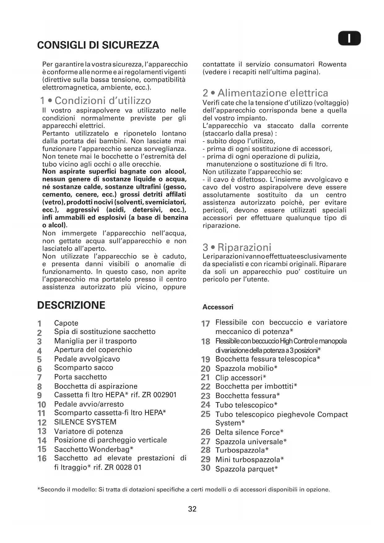 Per garantire la vostra sicurezza, l’apparecchio è conforme alle norme e ai regolamenti vigenti (direttive sulla bassa tensione, compatibilità elettromagnetica, ambiente, ecc.).Il vostro aspirapolvere va utilizzato nelle condizioni normalmente previste per gli apparecchi elettrici.Pertanto utilizzatelo e riponetelo lontano dalla portata dei bambini. Non lasciate mai funzionare l’apparecchio senza sorveglianza. Non tenete mai le bocchette o l’estremità del tubo vicino agli occhi o alle orecchie. Non aspirate superfi ci bagnate con alcool, nessun genere di sostanze liquide o acqua, né sostanze calde, sostanze ultrafi ni (gesso, cemento, cenere, ecc.) grossi detriti affi lati (vetro), prodotti nocivi (solventi, sverniciatori, ecc.), aggressivi (acidi, detersivi, ecc.), infi ammabili ed esplosivi (a base di benzina o alcol).Non immergete l’apparecchio nell’acqua, non gettate acqua sull’apparecchio e non lasciatelo all’aperto.Non utilizzate l’apparecchio se è caduto, e presenta danni visibili o anomalie di funzionamento. In questo caso, non aprite l’apparecchio ma portatelo presso il centro assistenza autorizzato più vicino, oppure contattate il servizio consumatori Rowenta (vedere i recapiti nell’ultima pagina).Verifi cate che la tensione d’utilizzo (voltaggio) dell’apparecchio corrisponda bene a quella del vostro impianto.L’apparecchio va staccato dalla corrente (staccarlo dalla presa) :- subito dopo l’utilizzo,- prima di ogni sostituzione di accessori,- prima di ogni operazione di pulizia, manutenzione o sostituzione di fi ltro.Non utilizzate l’apparecchio se:- il cavo è difettoso. L’insieme avvolgicavo e cavo del vostro aspirapolvere deve essere assolutamente sostituito da un centro assistenza autorizzato poichè, per evitare pericoli, devono essere utilizzati speciali accessori per effettuare qualunque tipo di riparazione. Le riparazioni vanno effettuate esclusivamente da specialisti e con ricambi originali. Riparare da soli un apparecchio puo’ costituire un pericolo per l’utente.