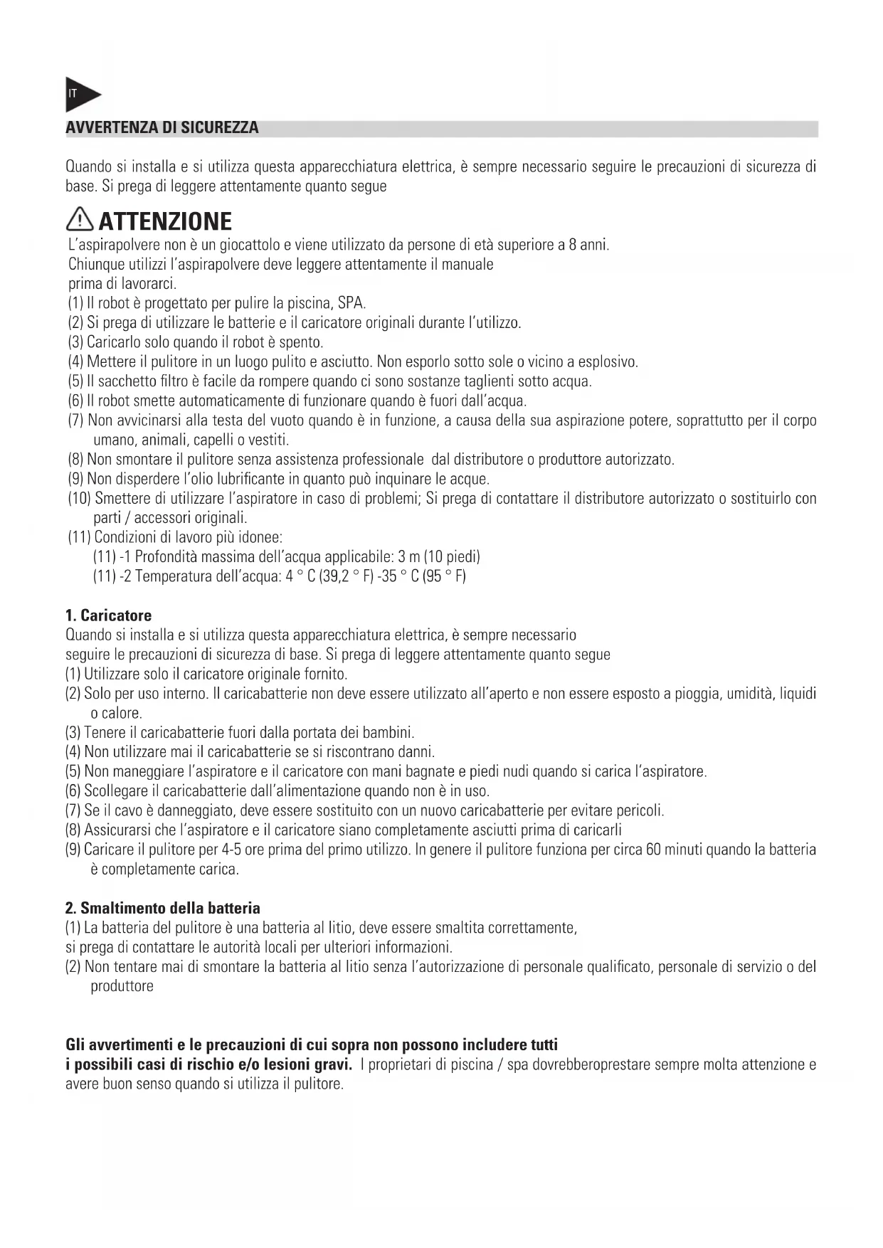 Quando si installa e si utilizza questa apparecchiatura elettrica, è sempre necessario seguire le precauzioni di sicurezza di base. Si prega di leggere attentamente quanto segue ATTENZIONE L’aspirapolvere non è un giocattolo e viene utilizzato da persone di età superiore a 8 anni. Chiunque utilizzi l’aspirapolvere deve leggere attentamente il manuale prima di lavorarci. (1) Il robot è progettato per pulire la piscina, SPA. (2) Si prega di utilizzare le batterie e il caricatore originali durante l’utilizzo. (3) Caricarlo solo quando il robot è spento. (4) Mettere il pulitore in un luogo pulito e asciutto. Non esporlo sotto sole o vicino a esplosivo. (5) Il sacchetto filtro è facile da rompere quando ci sono sostanze taglienti sotto acqua. (6) Il robot smette automaticamente di funzionare quando è fuori dall’acqua. (7) Non avvicinarsi alla testa del vuoto quando è in funzione, a causa della sua aspirazione potere, soprattutto per il corpo umano, animali, capelli o vestiti. (8) Non smontare il pulitore senza assistenza professionale dal distributore o produttore autorizzato. (9) Non disperdere l’olio lubrificante in quanto può inquinare le acque. (10) Smettere di utilizzare l’aspiratore in caso di problemi; Si prega di contattare il distributore autorizzato o sostituirlo con parti / accessori originali. (11) Condizioni di lavoro più idonee: (11) -1 Profondità massima dell’acqua applicabile: 3 m (10 piedi) (11) -2 Temperatura dell’acqua: 4 ° C (39,2 ° F) -35 ° C (95 ° F)