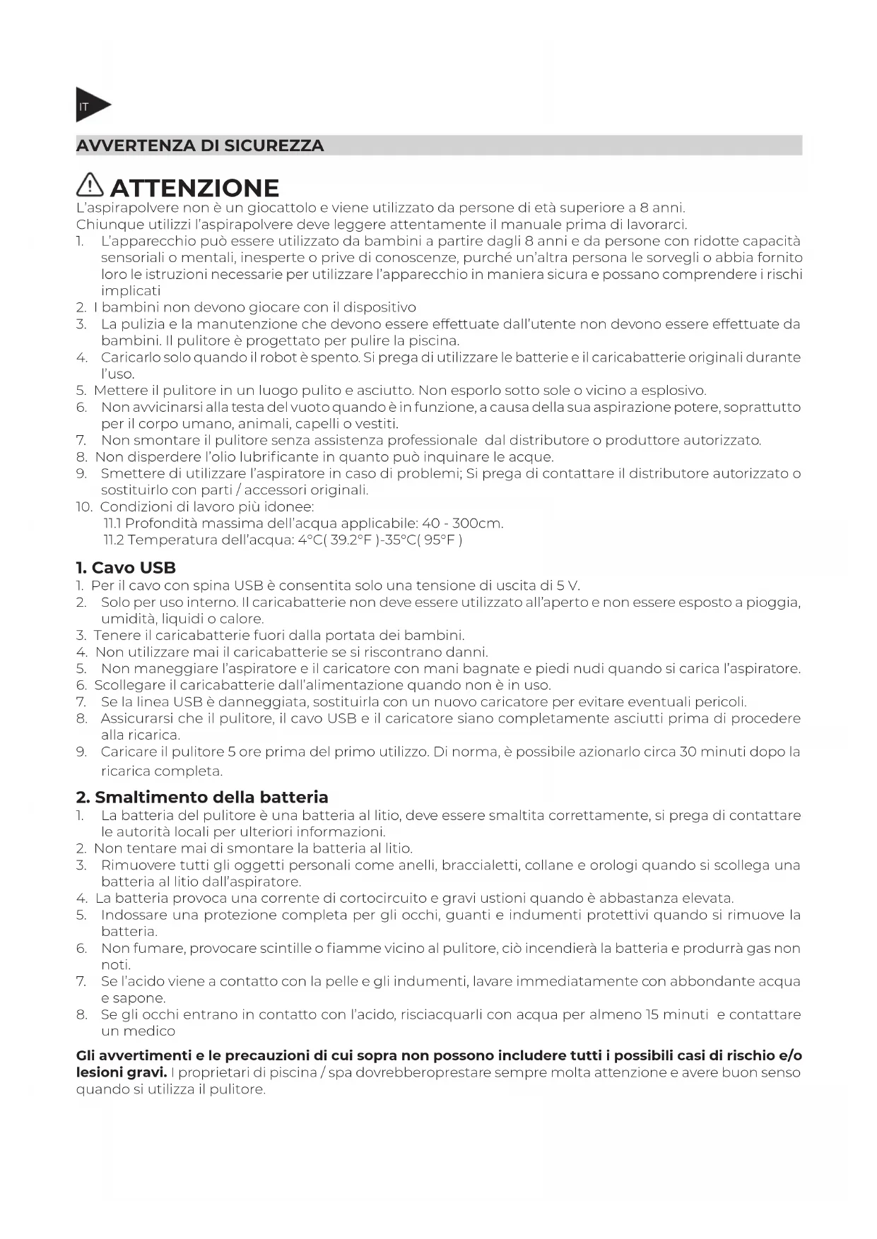 Il robot non cattura le parti di sporco. Il livello della batteria è basso. Procedere alla carica del robot. Girante bloccato. Spegnere l’alimentazione del robot e controllare visivamente se il girante ruota. Se necessario, contattare il proprio rivenditore per ulteriori istruzioni. Avvertenza! Prima di intervenire sul dispositivo, assicurarsi che sia spento. Girante danneggiato. Contattare il proprio rivenditore per la sostituzione. Il vano portaoggetti è pieno. Pulire il vano portaoggetti e il coperchio del filtro. Il robot smette di muoversi al centro della piscina (la testa rotante sta ancora girando). Il robot è stato fermato da un ostacolo. Il terreno non è totalmente livellato Controllare il pulitore per eventuali ostruzioni. Rimuovere gli ostacoli. Il robot è bloccato dall’aspirazione dello scarico principale del pavimento della piscina. Ci vuole più tempo prima di spostarsi di nuovo o livellare il fondo della piscina o tagliare la striscia della spazzola inferiore. Contattare il proprio rivenditore per le parti di ricambio. Il terreno non è totalmente livellato It takes more minutes before moving again or Make the bottom of the pool flat or trim the bottom brush strip. Contact your dealer for replacement parts. Il robot non può coprire l’intera piscina / muoversi lungo la parete della piscina. Il vano portaoggetti è pieno. Pulire il vano portaoggetti e il coperchio del filtro. Il tempo di funzionamento è stato più breve del previsto. Pulire la camera del filtro e ricaricare il robot per 4-5 ore. La circolazione dell’acqua generata dal sistema di filtrazione interrompe la direzione del movimento. Spegnere il sistema di filtrazione (fare riferimento alle istruzioni presenti nel manuale). La ruota è bloccata. Controllare e rimuovere le parti di sporco. Il robot si muove lentamente. Il vano portaoggetti è pieno. Pulire il vano portaoggetti e il coperchio del filtro. La testa girevole non ruota o ruota lentamente. Il fondo del girante è bloccato. Il vano portaoggetti è pieno, controllare e rimuovere eventuali parti di sporco che potrebbero essere incastrate sotto la testa rotante. Può essere ruotato a mano e risciacquato con acqua fino a che non risulta liscio. Il vano portaoggetti è pieno. Pulire il vano portaoggetti e il coperchio del filtro.IT