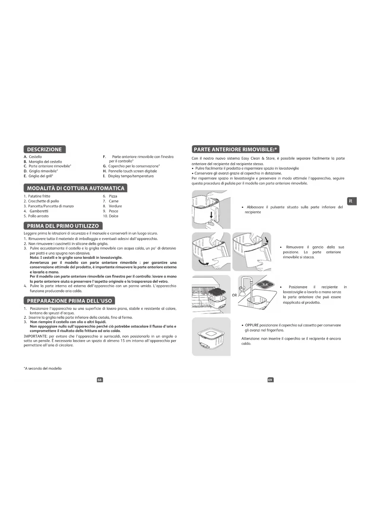 - OPPURE posizionare il coperchio sul cassetto per conservare gli avanzi nel frigorifero. Attenzione: non inserire il coperchio se il recipiente è ancora caldo. *A seconda del modello DESCRIZIONE A. Cestello B. Maniglia del cestello C. Parte anteriore rimovibile* D. Griglia rimovibile* E. Griglia del grill* F. Parte anteriore rimovibile con finestra per il controllo* G. Coperchio per la conservazione* H. Pannello touch screen digitale
