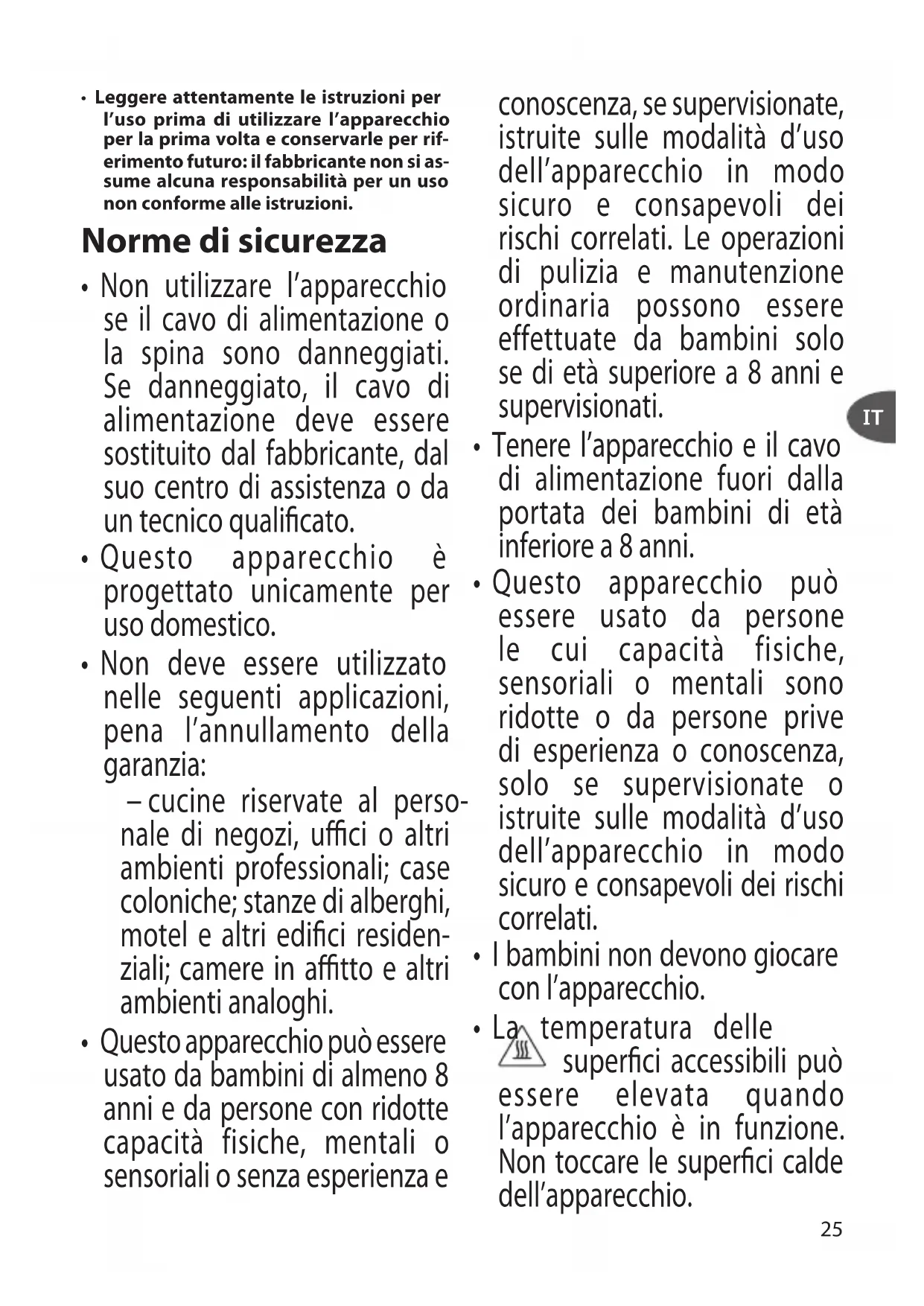 - Leggere attentamente le istruzioni per l’uso prima di utilizzare l’apparecchio per la prima volta e conservarle per rif- erimento futuro: il fabbricante non si as- sume alcuna responsabilità per un uso non conforme alle istruzioni. Norme di sicurezza