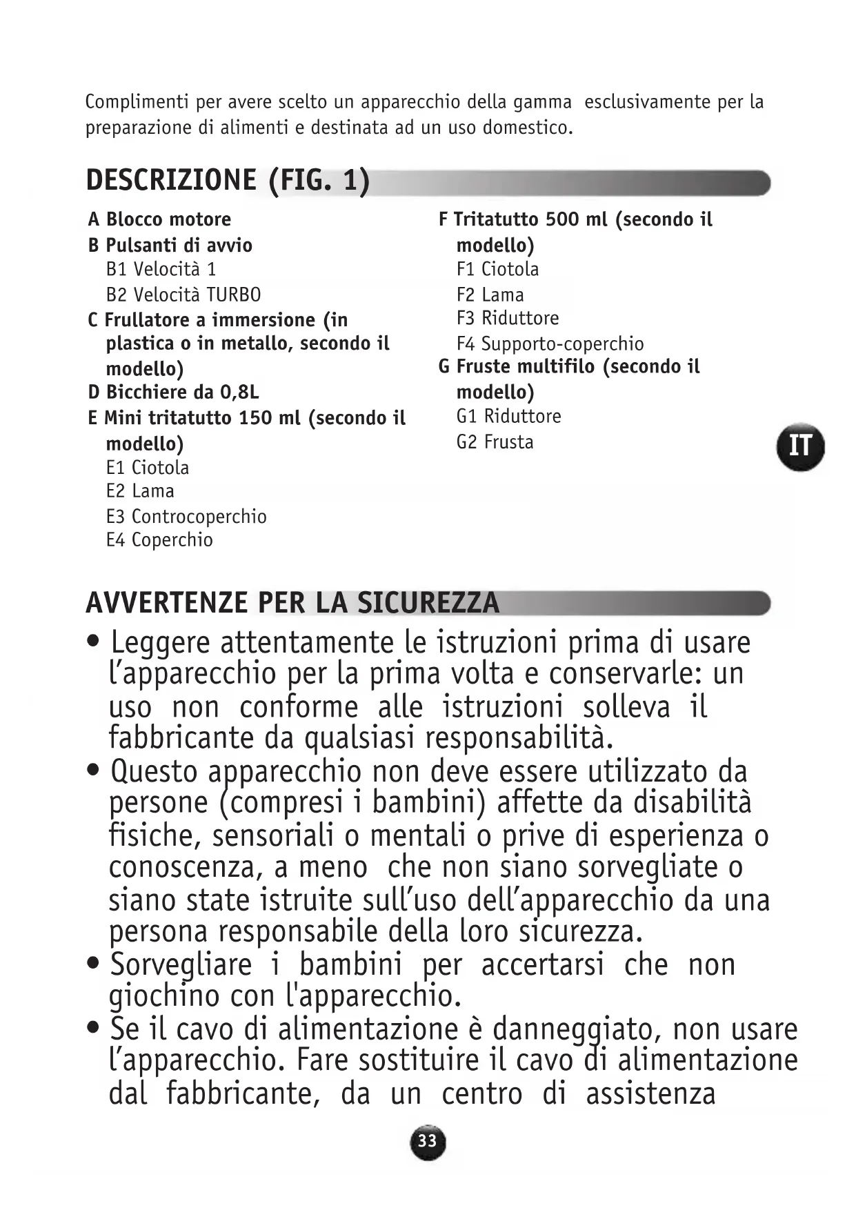 - Se il cavo di alimentazione è danneggiato, non usare l’apparecchio. Fare sostituire il cavo di alimentazione dal fabbricante, da un centro di assistenza A Blocco motore B Pulsanti di avvio B1 Velocità 1 B2 Velocità TURBO C Frullatore a immersione (in plastica o in metallo, secondo il modello) D Bicchiere da 0,8L E Mini tritatutto 150 ml (secondo il modello) E1 Ciotola E2 Lama E3 Controcoperchio E4 Coperchio F Tritatutto 500 ml (secondo il modello) F1 Ciotola F2 Lama F3 Riduttore F4 Supporto-coperchio G Fruste multifilo (secondo il modello) G1 Riduttore G2 Frustaautorizzato (consultare l’elenco nel libretto di istruzioni) o da un tecnico qualificato per evitare ogni rischio.