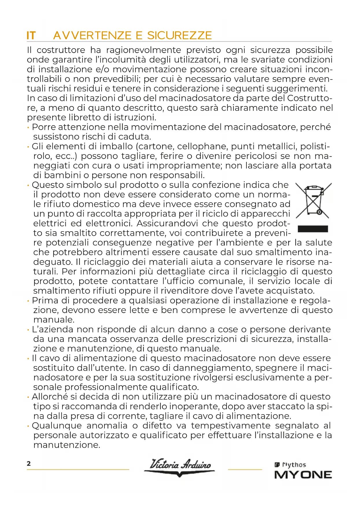 Scarica le istruzioni per il tuo Macchina da caffè in formato PDF gratuitamente! Trova il tuo manuale My One - Victoria Arduino e riprendi in mano il tuo dispositivo elettronico. In questa pagina sono pubblicati tutti i documenti necessari per l'utilizzo del tuo dispositivo. My One del marchio Victoria Arduino.
