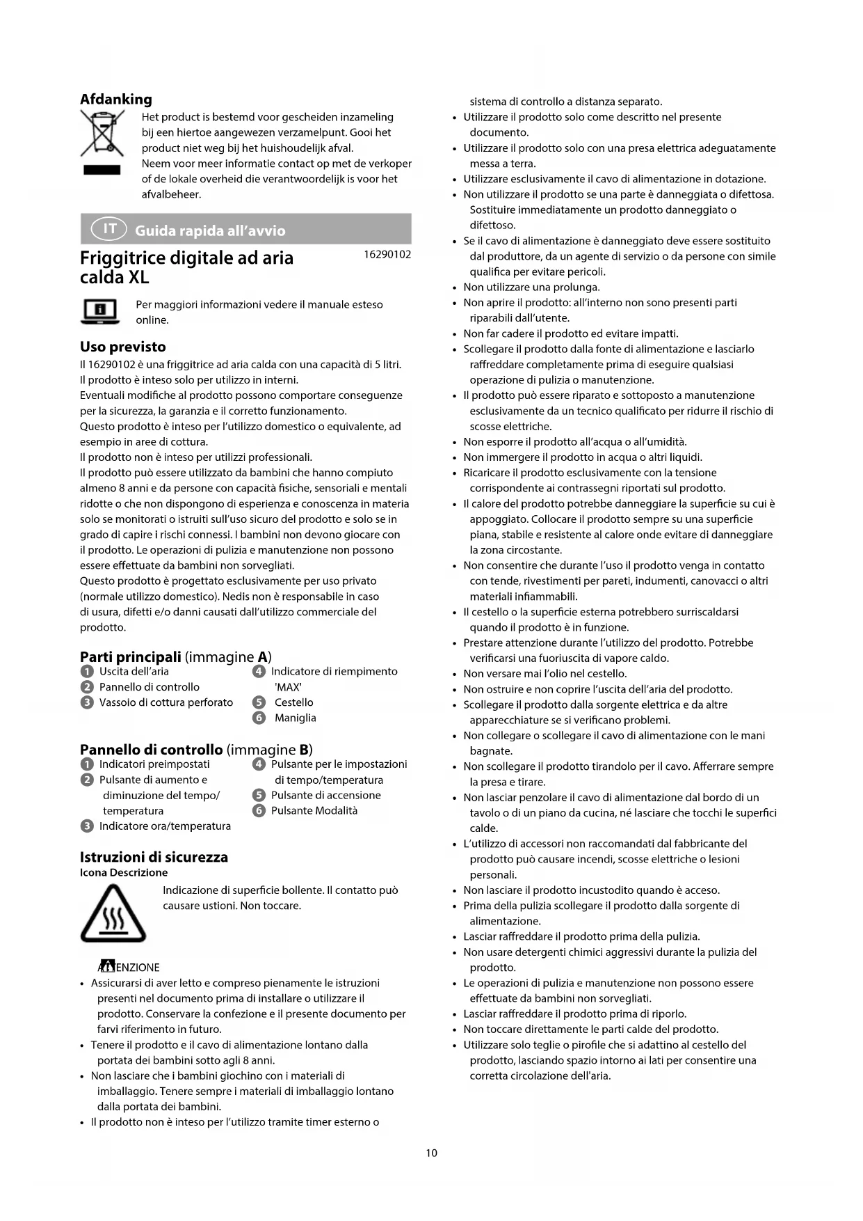 Guida rapida all’avvio Friggitrice digitale ad aria calda XL 16290102Per maggiori informazioni vedere il manuale esteso online. Uso previsto Il 16290102 è una friggitrice ad aria calda con una capacità di 5 litri.Il prodotto è inteso solo per utilizzo in interni.Eventuali modiche al prodotto possono comportare conseguenze per la sicurezza, la garanzia e il corretto funzionamento.Questo prodotto è inteso per l’utilizzo domestico o equivalente, ad esempio in aree di cottura.Il prodotto non è inteso per utilizzi professionali.Il prodotto può essere utilizzato da bambini che hanno compiuto almeno 8 anni e da persone con capacità siche, sensoriali e mentali ridotte o che non dispongono di esperienza e conoscenza in materia solo se monitorati o istruiti sull’uso sicuro del prodotto e solo se in grado di capire i rischi connessi. I bambini non devono giocare con il prodotto. Le operazioni di pulizia e manutenzione non possono essere eettuate da bambini non sorvegliati.Questo prodotto è progettato esclusivamente per uso privato (normale utilizzo domestico). Nedis non è responsabile in caso di usura, difetti e/o danni causati dall’utilizzo commerciale del prodotto. Parti principali (immagine A) 1 Uscita dell’aria 2 Pannello di controllo 3 Vassoio di cottura perforato 4 Indicatore di riempimento 'MAX' 5 Cestello 6 Maniglia Pannello di controllo (immagine B) 1 Indicatori preimpostati 2 Pulsante di aumento e diminuzione del tempo/temperatura 3 Indicatore ora/temperatura 4 Pulsante per le impostazioni di tempo/temperatura 5 Pulsante di accensione 6 Pulsante Modalità Istruzioni di sicurezza Icona DescrizioneIndicazione di supercie bollente. Il contatto può causare ustioni. Non toccare. ATTENZIONE• Assicurarsi di aver letto e compreso pienamente le istruzioni presenti nel documento prima di installare o utilizzare il prodotto. Conservare la confezione e il presente documento per farvi riferimento in futuro.• Tenere il prodotto e il cavo di alimentazione lontano dalla portata dei bambini sotto agli 8 anni.• Non lasciare che i bambini giochino con i materiali di imballaggio. Tenere sempre i materiali di imballaggio lontano dalla portata dei bambini.• Il prodotto non è inteso per l’utilizzo tramite timer esterno o11 Smaltimento Questo prodotto è soggetto a raccolta dierenziata nei punti di raccolta appropriati. Non smaltire il prodotto con i riuti domestici.Per maggiori informazioni, contattare il rivenditore o le autorità locali responsabili per la gestione dei riuti.