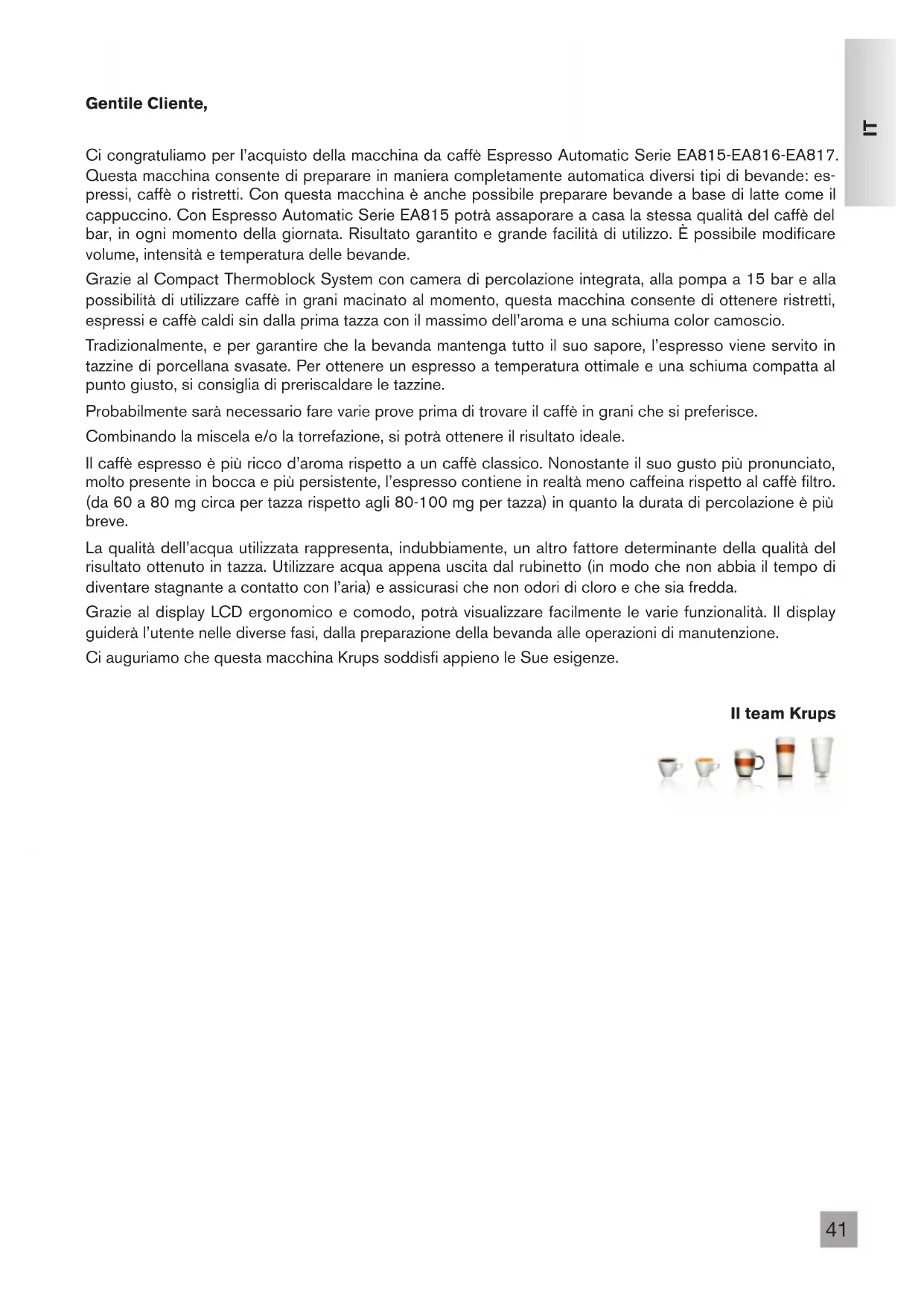 Gentile Cliente, Ci congratuliamo per l’acquisto della macchina da caffè Espresso Automatic Serie EA815-EA816-EA817. Questa macchina consente di preparare in maniera completamente automatica diversi tipi di bevande: es- pressi, caffè o ristretti. Con questa macchina è anche possibile preparare bevande a base di latte come il cappuccino. Con Espresso Automatic Serie EA815 potrà assaporare a casa la stessa qualità del caffè del bar, in ogni momento della giornata. Risultato garantito e grande facilità di utilizzo. È possibile modificare volume, intensità e temperatura delle bevande. Grazie al Compact Thermoblock System con camera di percolazione integrata, alla pompa a 15 bar e alla possibilità di utilizzare caffè in grani macinato al momento, questa macchina consente di ottenere ristretti, espressi e caffè caldi sin dalla prima tazza con il massimo dell’aroma e una schiuma color camoscio. Tradizionalmente, e per garantire che la bevanda mantenga tutto il suo sapore, l’espresso viene servito in tazzine di porcellana svasate. Per ottenere un espresso a temperatura ottimale e una schiuma compatta al punto giusto, si consiglia di preriscaldare le tazzine. Probabilmente sarà necessario fare varie prove prima di trovare il caffè in grani che si preferisce. Combinando la miscela e/o la torrefazione, si potrà ottenere il risultato ideale. Il caffè espresso è più ricco d’aroma rispetto a un caffè classico. Nonostante il suo gusto più pronunciato, molto presente in bocca e più persistente, l’espresso contiene in realtà meno caffeina rispetto al caffè filtro. (da 60 a 80 mg circa per tazza rispetto agli 80-100 mg per tazza) in quanto la durata di percolazione è più breve. La qualità dell’acqua utilizzata rappresenta, indubbiamente, un altro fattore determinante della qualità del risultato ottenuto in tazza. Utilizzare acqua appena uscita dal rubinetto (in modo che non abbia il tempo di diventare stagnante a contatto con l’aria) e assicurasi che non odori di cloro e che sia fredda. Grazie al display LCD ergonomico e comodo, potrà visualizzare facilmente le varie funzionalità. Il display guiderà l’utente nelle diverse fasi, dalla preparazione della bevanda alle operazioni di manutenzione. Ci auguriamo che questa macchina Krups soddisfi appieno le Sue esigenze. Il team Krups42