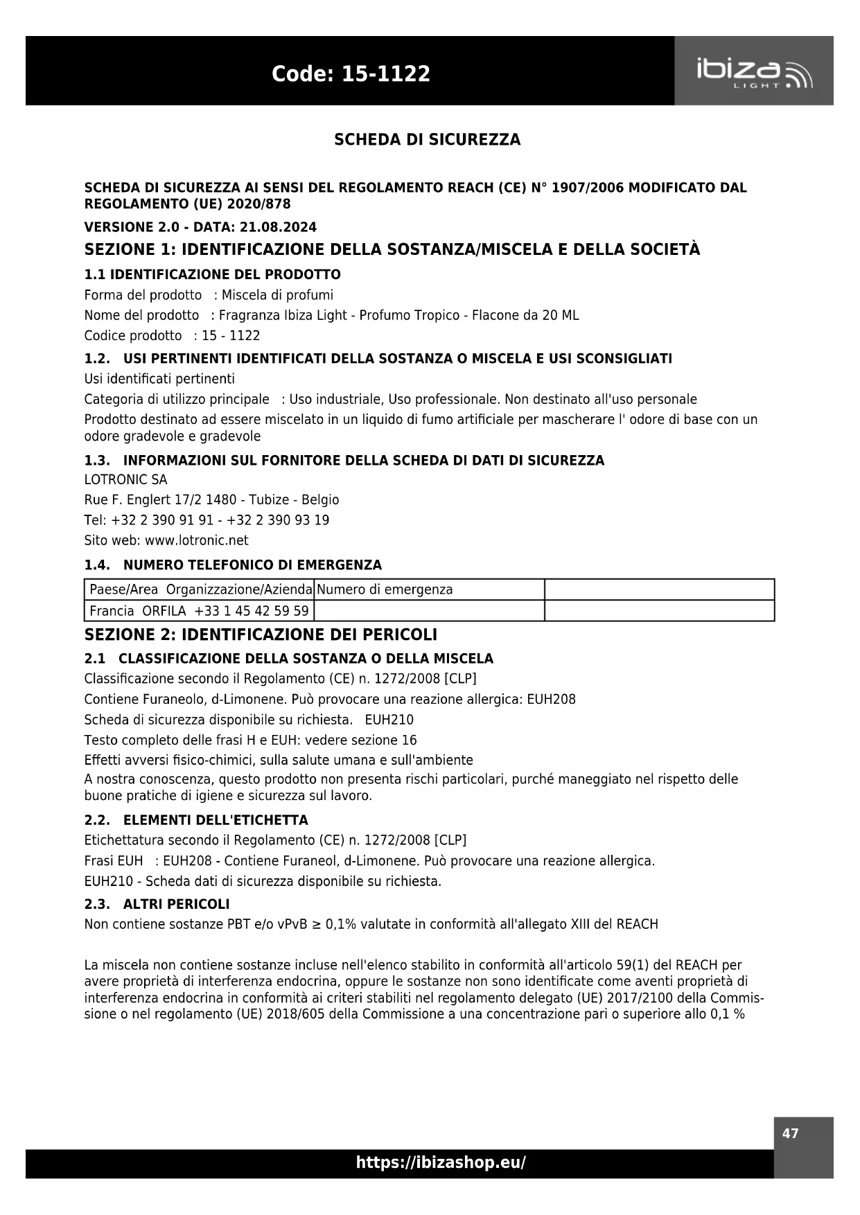 Forma del prodotto : Miscela di profumi Nome del prodotto : Fragranza Ibiza Light - Profumo Tropico - Flacone da 20 ML Codice prodotto : 15 - 1122 1.2. USI PERTINENTI IDENTIFICATI DELLA SOSTANZA O MISCELA E USI SCONSIGLIATI Usi identicati pertinenti Categoria di utilizzo principale : Uso industriale, Uso professionale. Non destinato all'uso personale Prodotto destinato ad essere miscelato in un liquido di fumo articiale per mascherare l' odore di base con un odore gradevole e gradevole 1.3. INFORMAZIONI SUL FORNITORE DELLA SCHEDA DI DATI DI SICUREZZA LOTRONIC SA Rue F. Englert 17/2 1480 - Tubize - Belgio Tel: +32 2 390 91 91 - +32 2 390 93 19 Sito web: www.lotronic.net