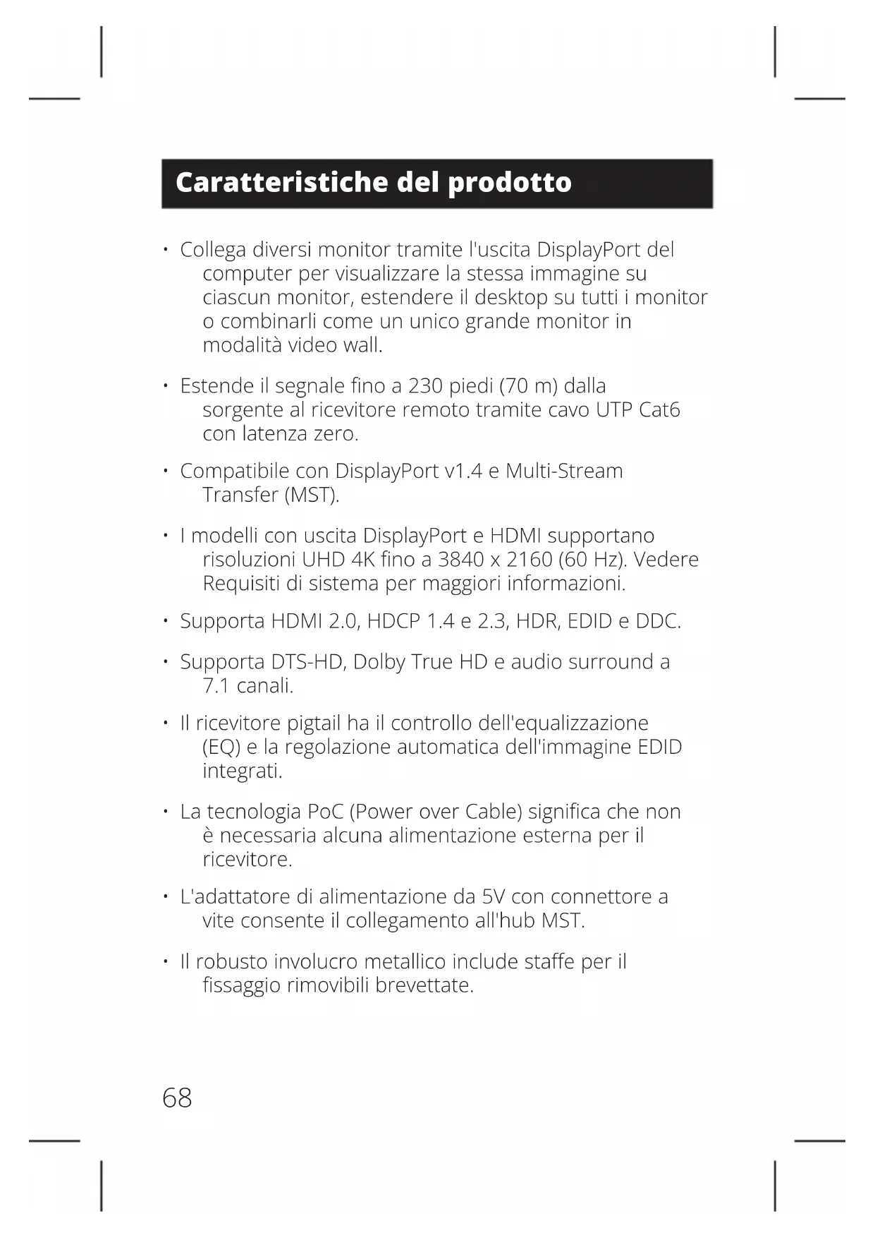 - Estende il segnale fino a 230 piedi (70 m) dalla sorgente al ricevitore remoto tramite cavo UTP Cat6 con latenza zero.