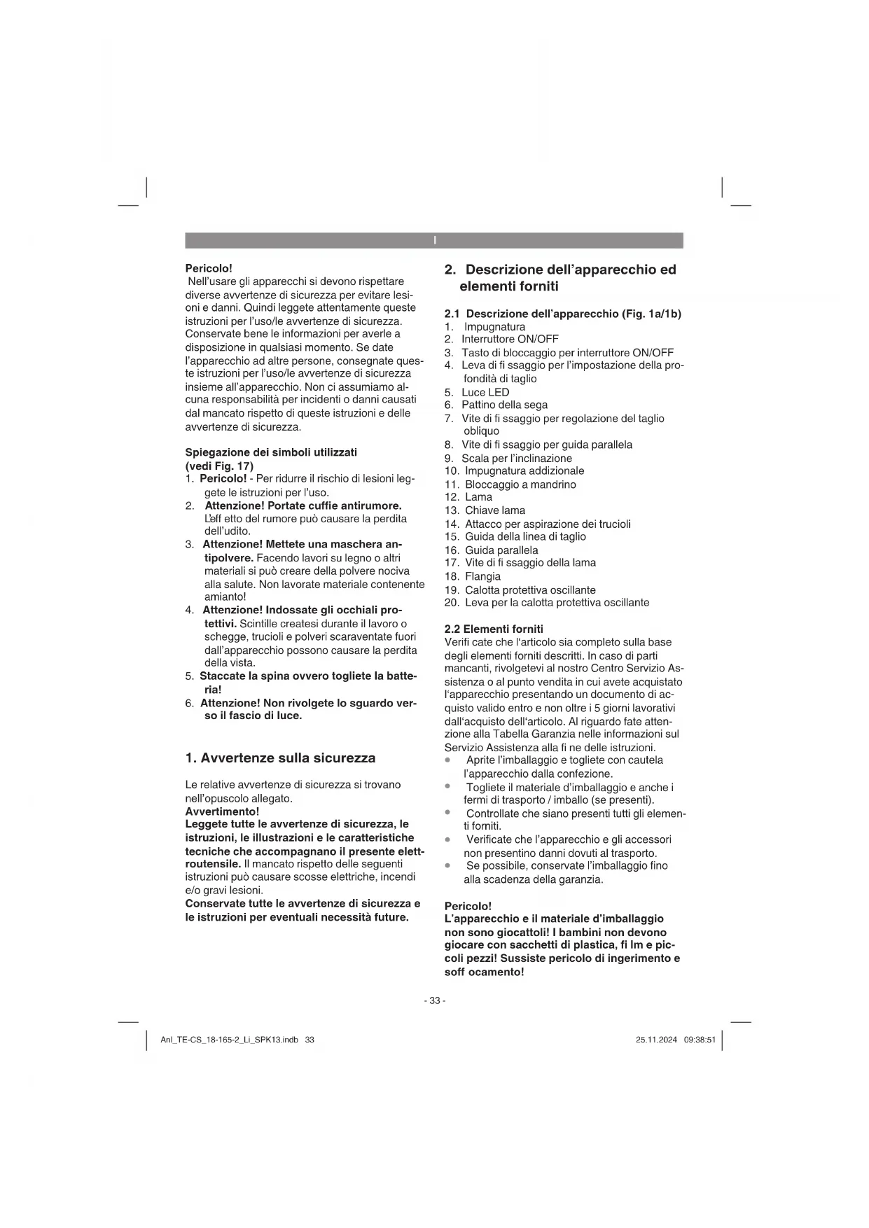 Controllate il funzionamento della calotta pro- tettiva oscillante. La calotta protettiva oscil- lante non deve essere bloccata e alla fine di ogni operazione deve trovarsi di nuovo nella posizione di partenza. Anl_TE-CS_18-165-2_Li_SPK13.indb 36Anl_TE-CS_18-165-2_Li_SPK13.indb 36 25.11.2024 09:38:5225.11.2024 09:38:52I