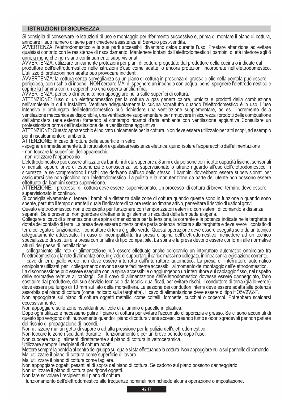Če je mogoče, ponev pokrijte s pokrovom. Ogenj uravnavajte tako, da ne prekriva premera ponve.42 IT Si consiglia di conservare le istruzioni di uso e montaggio per riferimento successivo e, prima di montare il piano di cottura, annotare il suo numero di serie per richiedere assistenza al Servizio post-vendita. AVVERTENZA: l'elettrodomestico e le sue parti accessibili diventano calde durante l'uso. Prestare attenzione ad evitare qualsiasi contatto con le resistenze di riscaldamento. Mantenere lontani dall'elettrodomestico i bambini di età inferiore agli 8 anni, a meno che non siano continuamente supervisionati. AVVERTENZA: utilizzare unicamente protezioni per piani di cottura progettate dal produttore della cucina o indicate dal produttore dell'elettrodomestico nelle istruzioni d'uso come adatte, o ancora protezioni incorporate nell'elettrodomestico. L'utilizzo di protezioni non adatte può provocare incidenti. AVVERTENZA: la cottura senza sorveglianza su un piano di cottura in presenza di grasso o olio nella pentola può essere pericolosa, con rischio di incendi. NON cercare MAI di spegnere un incendio con acqua, bensì spegnere l'elettrodomestico e coprire la fiamma con un coperchio o una coperta antifiamma. AVVERTENZA: pericolo di incendio: non appoggiare nulla sulle superfici di cottura. ATTENZIONE: l'uso di un elettrodomestico per la cottura a gas genera calore, umidità e prodotti della combustione nell'ambiente in cui è installato. Ventilare adeguatamente la cucina soprattutto quando l'elettrodomestico è in uso. L'uso intensivo e prolungato dell'elettrodomestico può richiedere una ventilazione supplementare, ad es. l'incremento della ventilazione meccanica se disponibile, una ventilazione supplementare per rimuovere in sicurezza i prodotti della combustione dall’atmosfera (aria esterna) fornendo al contempo ricambi d'aria ambiente con ventilazione aggiuntiva Consultare un professionista prima dell'installazione della ventilazione aggiuntiva. ATTENZIONE: Questo apparecchio è indicato unicamente per la cottura. Non deve essere utilizzato per altri scopi, ad esempio per il riscaldamento di ambienti. ATTENZIONE: In caso di rottura della superficie in vetro: - spegnere immediatamente tutti i bruciatori e qualsiasi resistenza elettrica, quindi isolare l'apparecchio dall’alimentazione - non toccare la superficie dell'apparecchio - non utilizzare l'apparecchio L'elettrodomestico può essere utilizzato da bambini di età superiore a 8 anni e da persone con ridotte capacità fisiche, sensoriali o mentali, oppure prive di esperienza e conoscenza, se supervisionate o istruite riguardo all'uso dell'elettrodomestico in sicurezza, e se comprendono i rischi che derivano dall'uso dello stesso. I bambini dovrebbero essere supervisionati per assicurarsi che non giochino con l'elettrodomestico. La pulizia e la manutenzione da parte dell'utente non possono essere effettuate da bambini senza supervisione. ATTENZIONE: il processo di cottura deve essere supervisionato. Un processo di cottura di breve termine deve essere supervisionato in continuo. Si consiglia vivamente di tenere i bambini a distanza dalle zone di cottura quando queste sono in funzione o quando sono spente, per tutto il tempo durante il quale l'indicatore di calore residuo rimane attivo, per evitare il rischio di ustioni gravi. Questo elettrodomestico non è concepito per funzionare con temporizzatori esterni o con sistemi di comando a distanza separati. Se è presente, non guardare direttamente gli elementi riscaldati della lampada alogena. Collegare al cavo di alimentazione una spina dimensionata per la tensione, la corrente e la potenza indicate nella targhetta e dotata del contatto di terra. La presa deve essere dimensionata per la potenza indicata sulla targhetta e deve avere il contatto di terra collegato e funzionante. Il conduttore di terra è giallo-verde. Questa operazione deve essere eseguita solo da un tecnico adeguatamente addestrato. In caso di incompatibilità tra presa e spina dell'elettrodomestico, richiedere ad un tecnico specializzato di sostituire la presa con un'altra di tipo compatibile. La spina e la presa devono essere conformi alle normative attuali del paese di installazione. Il collegamento alla rete di alimentazione può essere effettuato anche collocando un interruttore automatico onnipolare tra l'elettrodomestico e la rete di alimentazione, in grado di supportare il carico massimo collegato, in linea con la legislazione corrente. Il cavo di terra giallo-verde non deve essere interrotto dall'interruttore automatico. La presa o l'interruttore automatico onnipolare utilizzati per il collegamento devono essere facilmente accessibili al momento del montaggio dell'elettrodomestico. La disconnessione può essere eseguita con la spina accessibile o aggiungendo un interruttore sul cablaggio fisso, nel rispetto delle normative relative ai cablaggi. Se il cavo di alimentazione dell'elettrodomestico dovesse essere danneggiato, farlo sostituire dal produttore, dal suo servizio tecnico o da tecnici qualificati, per evitare rischi. Il conduttore di terra (giallo-verde) deve essere più lungo di 10 mm sul lato della morsettiera. La sezione dei conduttori interni deve essere adatta alla potenza assorbita dal piano di cottura (come indicato sulla targhetta). Il cavo di alimentazione deve essere di tipo HO5V2V2-F. Non appoggiare sul piano di cottura oggetti metallici come coltelli, forchette, cucchiai o coperchi. Potrebbero scaldarsi eccessivamente. Non appoggiare sulle zone riscaldanti pellicole di alluminio e padelle in plastica. Dopo ogni utilizzo è necessario pulire il piano di cottura per evitare l'accumulo di sporcizia e grasso. Se ci sono accumuli di questo tipo vengono cotti nuovamente quando il piano di cottura viene acceso, creando fumo e odori sgradevoli per non parlare del rischio di propagazione di incendi. Non utilizzare mai un getto di vapore o ad alta pressione per la pulizia dell'elettrodomestico. N