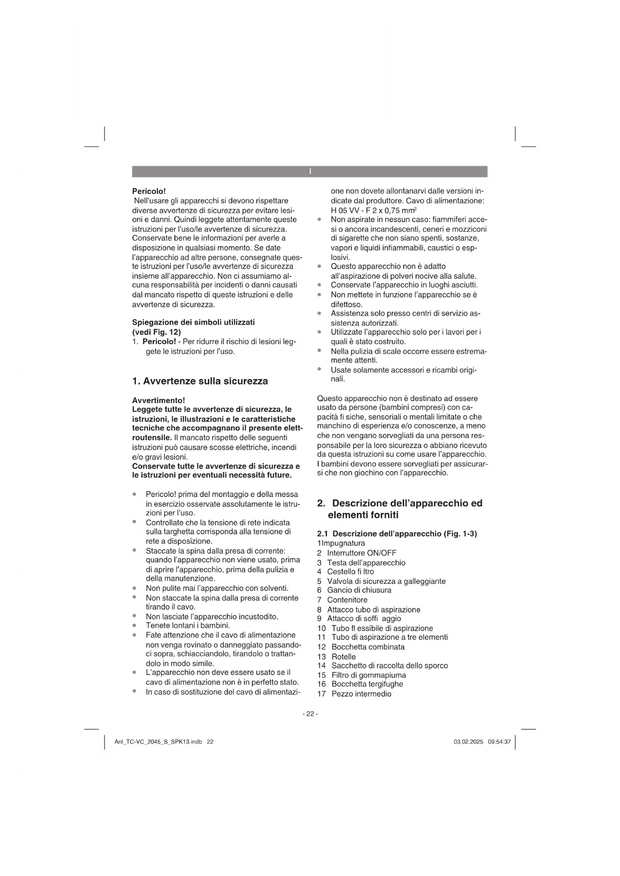 1 Impugnatura 2 Interruttore ON/OFF 3 Testa dell’apparecchio 4 Cestello fi ltro 5 Valvola di sicurezza a galleggiante 6 Gancio di chiusura 7 Contenitore 8 Attacco tubo di aspirazione 9 Attacco di soffi aggio 10 Tubo fl essibile di aspirazione 11 Tubo di aspirazione a tre elementi 12 Bocchetta combinata 13 Rotelle 14 Sacchetto di raccolta dello sporco 15 Filtro di gommapiuma 16 Bocchetta tergifughe 17 Pezzo intermedio Anl_TC-VC_2045_S_SPK13.indb 22Anl_TC-VC_2045_S_SPK13.indb 22 03.02.2025 09:54:3703.02.2025 09:54:37I