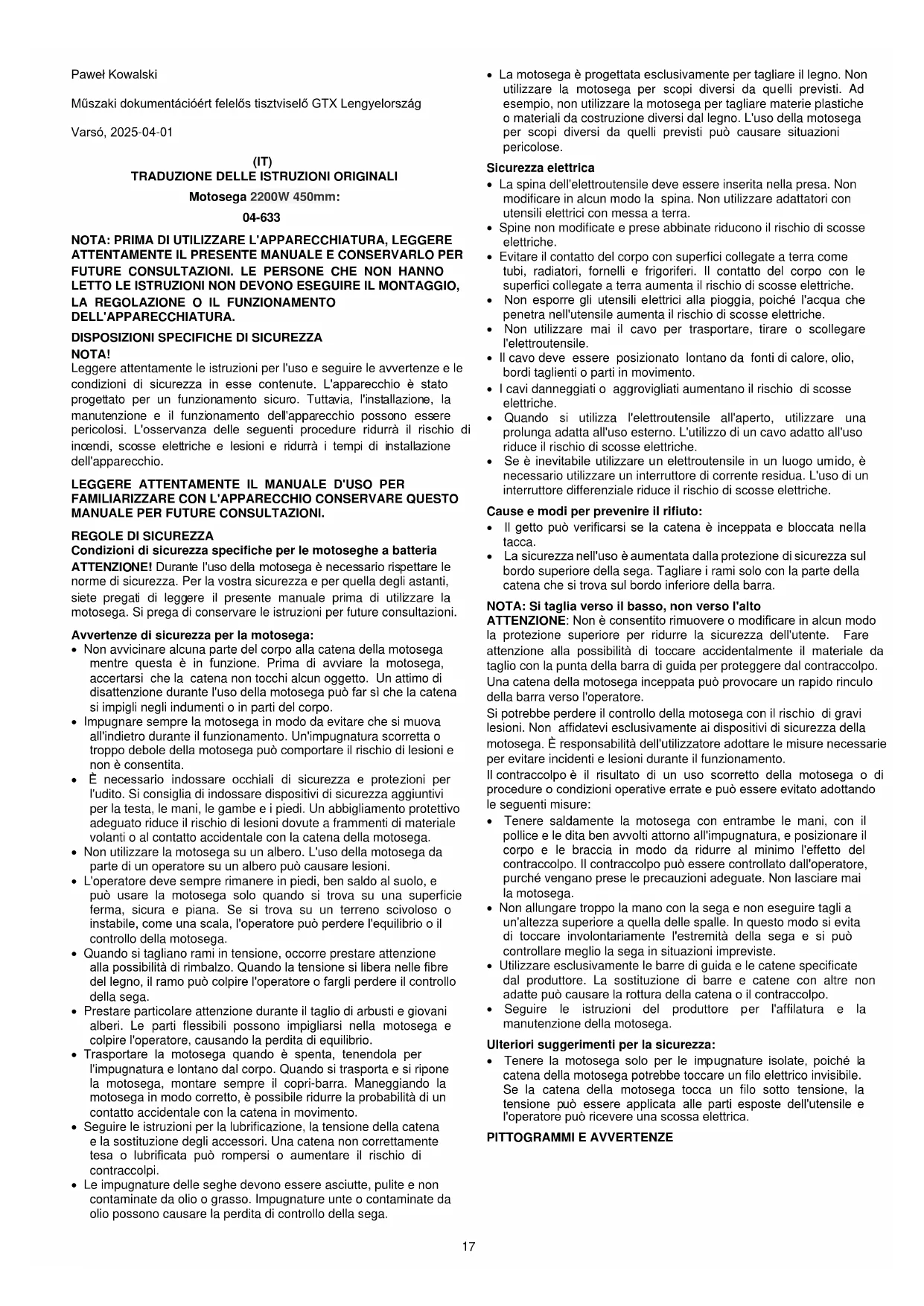 EN IEC 63000:2018 La presente dichiarazione si riferisce solo alla macchina così come immessa sul mercato e non comprende i componenti aggiunte dall'utente finale o eseguite da lui successivamente. Nome e indirizzo della persona residente nell'UE autorizzata a preparare il fascicolo tecnico: Firmato a nome di: GTX Poland Sp. z o.o. Sp.k. 2/4 Via Pograniczna 02-285 Varsavia Paweł Kowalski Addetto alla documentazione tecnica GTX Polonia Varsavia, 2025-04-01 (FR)