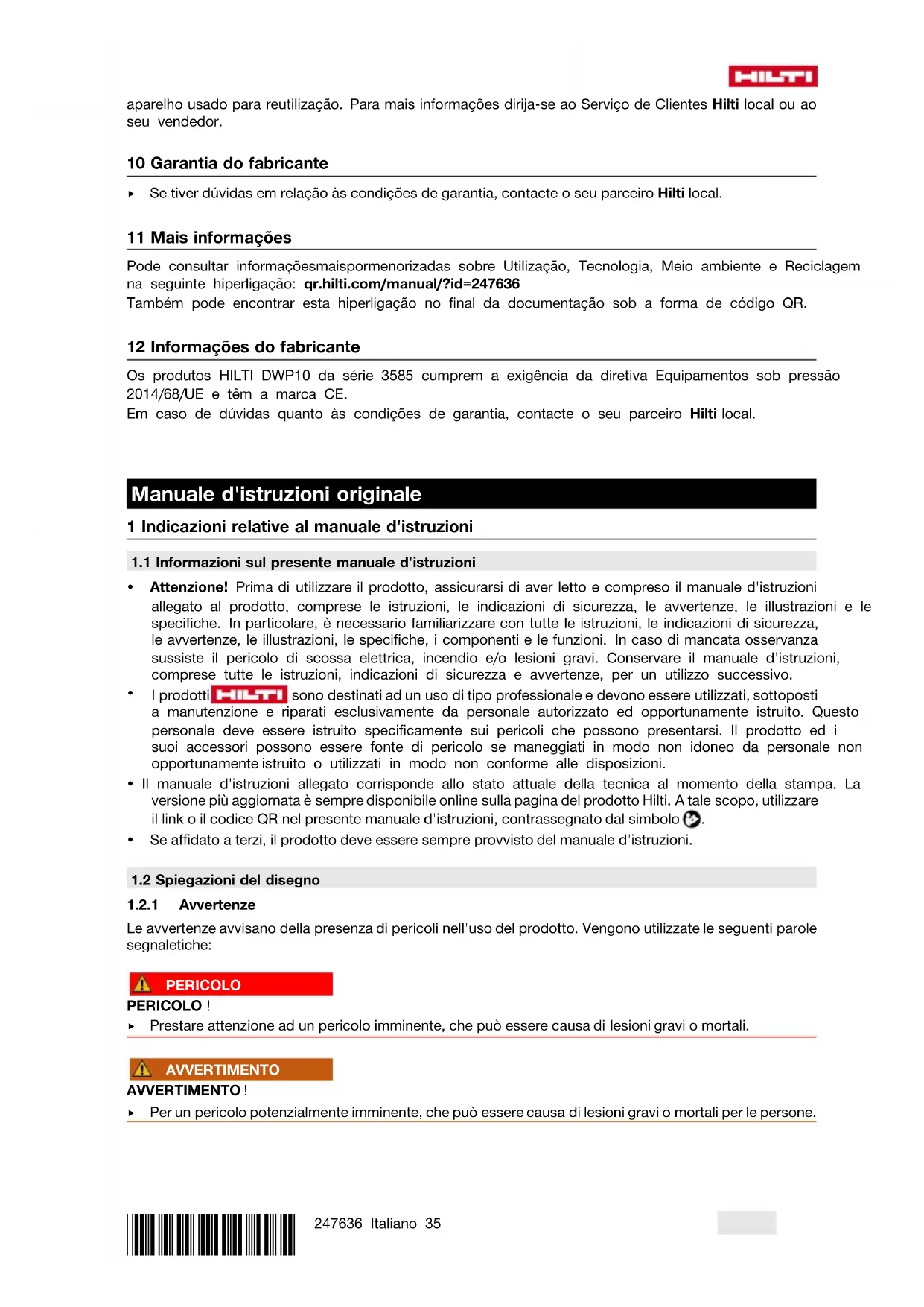 Anomalia Possibile causa Soluzione Nel dispositivo di alimenta- zione acqua non si genera pressione Pompa non avvitata a fondo ▶ Avvitare a fondo la pompa. O-ring della pompa difettoso ▶ Fare riparare l'attrezzo dal Centro Riparazioni Hilti . Manicotto difettoso ▶ Fare riparare l'attrezzo dal Centro Riparazioni Hilti . Il liquido penetra in alto dalla pompa Rondella valvola sporca o difettosa ▶ Pulire la rondella della valvola o far riparare il dispositivo da un Centro Riparazioni Hilti. La valvola di sicurezza si sca- rica con troppo anticipo Valvola di sicurezza difettosa ▶ Fare riparare l'attrezzo dal Centro Riparazioni Hilti. Il manometro non indica la pressione del serbatoio Manometro difettoso ▶ Fare riparare l'attrezzo dal Centro Riparazioni Hilti . 9 Smaltimento Non gettare questo prodotto tra i rifiuti domestici! Hilti Gli strumenti e gli attrezzi Hilti sono in gran parte realizzati con materiali riciclabili. Condizione essenziale per il riciclaggio è che i materiali vengano accuratamente separati. In molti Paesi Hilti ritira il vostro vecchio attrezzo. Rivolgetevi al Servizio Clienti Hilti oppure al vostro referente Hilti. 10 Garanzia del costruttore ▶ In caso di domande sulle condizioni di garanzia, rivolgersi al partner locale Hilti. 11 Ulteriori informazioni Per ulteriori informazioni riguardo ad utilizzo, tecnologia, aspetti ambientali e riciclaggio, consultare il seguente link: qr.hilti.com/manual/?id=247636 Tale link è riportato, come codice QR, anche all'ultima pagina della documentazione.*247636* 247636 Dansk 41 12 Informazioni del costruttore I prodotti HILTI DWP10 della serie 3585 soddisfano i requisiti della direttiva delle apparecchiature a pressione 2014/68/UE e riportano il marchio CE. In caso di domande sulle condizioni di garanzia, rivolgersi al partner locale Hilti. Original brugsanvisning 1 Om brugsanvisningen