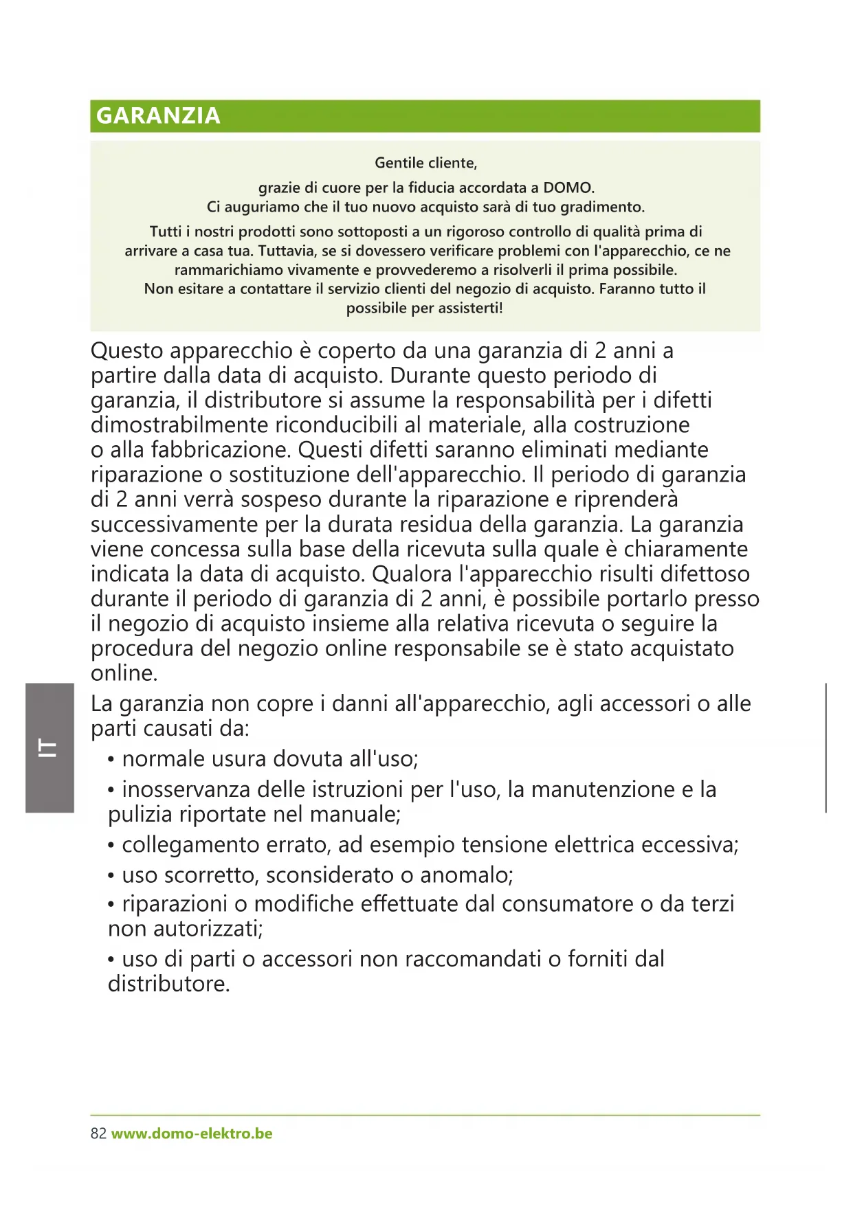 GARANZIA Gentile cliente, grazie di cuore per la ducia accordata a DOMO. Ci auguriamo che il tuo nuovo acquisto sarà di tuo gradimento. Tutti i nostri prodotti sono sottoposti a un rigoroso controllo di qualità prima di arrivare a casa tua. Tuttavia, se si dovessero vericare problemi con l'apparecchio, ce ne rammarichiamo vivamente e provvederemo a risolverli il prima possibile. Non esitare a contattare il servizio clienti del negozio di acquisto. Faranno tutto il possibile per assisterti! Questo apparecchio è coperto da una garanzia di 2 anni a partire dalla data di acquisto. Durante questo periodo di garanzia, il distributore si assume la responsabilità per i difetti dimostrabilmente riconducibili al materiale, alla costruzione o alla fabbricazione. Questi difetti saranno eliminati mediante riparazione o sostituzione dell'apparecchio. Il periodo di garanzia di 2 anni verrà sospeso durante la riparazione e riprenderà successivamente per la durata residua della garanzia. La garanzia viene concessa sulla base della ricevuta sulla quale è chiaramente indicata la data di acquisto. Qualora l'apparecchio risulti difettoso durante il periodo di garanzia di 2 anni, è possibile portarlo presso il negozio di acquisto insieme alla relativa ricevuta o seguire la procedura del negozio online responsabile se è stato acquistato online. La garanzia non copre i danni all'apparecchio, agli accessori o alle parti causati da: