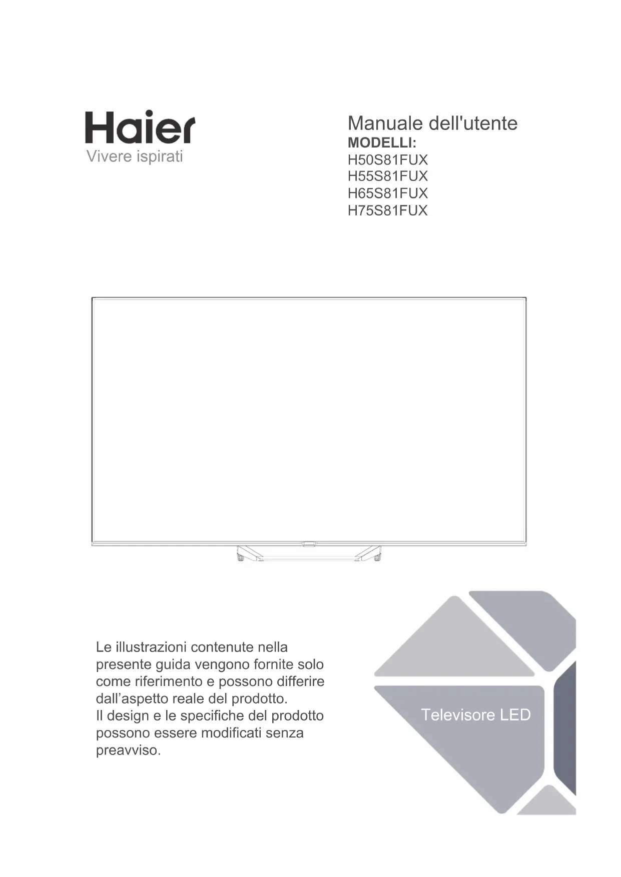 Scarica le istruzioni per il tuo Televisore in formato PDF gratuitamente! Trova il tuo manuale H55S81FUX - HAIER e riprendi in mano il tuo dispositivo elettronico. In questa pagina sono pubblicati tutti i documenti necessari per l'utilizzo del tuo dispositivo. H55S81FUX del marchio HAIER.