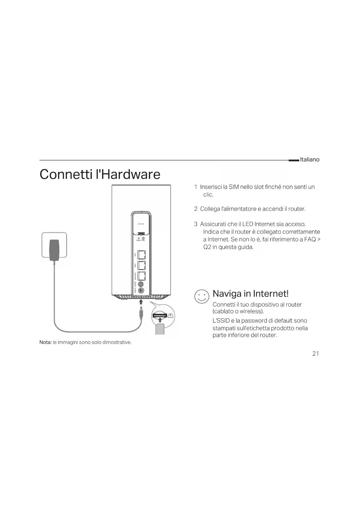 - Si le mot de passe WiFi par défaut a été modifié, connectez-vous à la page de gestion Web du routeur et récupérez ou réinitialisez votre mot de passe. Remarque : Pour plus d'aide au dépannage, veuillez vous référer à la FAQ sur notre site Web : https://www.tp-link.com/fr.21 Italiano Connetti l'Hardware 1 Inserisci la SIM nello slot finché non senti un clic. 2 Collega l'alimentatore e accendi il router. 3 Assicurati che il LED Internet sia acceso. Indica che il router è collegato correttamente a Internet. Se non lo è, fai riferimento a FAQ > Q2 in questa guida. Connetti il tuo dispositivo al router (cablato o wireless). L'SSID e la password di default sono stampati sull'etichetta prodotto nella parte inferiore del router. Naviga in Internet! Nota: le immagini sono solo dimostrative.22 Italiano Personalizza il Router 5G/4G+ 1 Assicurati che il computer sia connesso al router (via cavo o wireless). 2 Immetti nella barra degli indirizzi di un browser web http://tplinkmodem.net o http://192.168. 1.1. Basato sulla pagina di login corrente della gestione web: utilizza admin di default per nome utente e password o crea una nuova password per il login. 3 Segui le istruzioni dettagliate nella pagina Quick Setup (Configurazione Rapida) per completare la configurazione iniziale. Nota: il router può essere utilizzato (o congurato) anche in modalità router wireless per le connessioni via cavo. Per maggiori informazioni, consulta la Guida Utente all'indirizzo www.tp-link.com/it. FAQ (Domande frequenti) Q1. Cosa devo fare se non posso accedere alla pagina di gestione web?