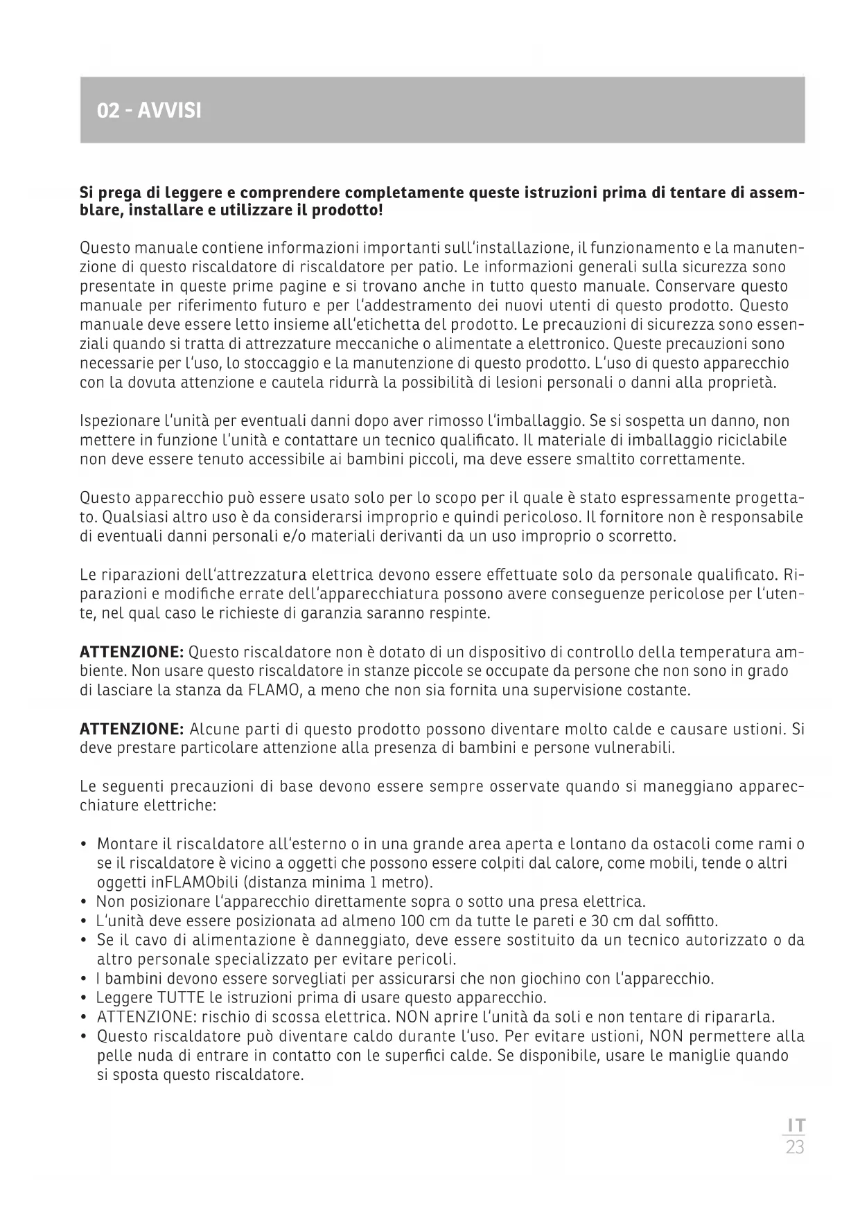02 AVVISI Si prega di leggere e comprendere completamente queste istruzioni prima di tentare di assem- blare, installare e utilizzare il prodotto! Questo manuale contiene informazioni importanti sull‘installazione, il funzionamento e la manuten- zione di questo riscaldatore di riscaldatore per patio. Le informazioni generali sulla sicurezza sono presentate in queste prime pagine e si trovano anche in tutto questo manuale. Conservare questo manuale per riferimento futuro e per l‘addestramento dei nuovi utenti di questo prodotto. Questo manuale deve essere letto insieme all‘etichetta del prodotto. Le precauzioni di sicurezza sono essen- ziali quando si tratta di attrezzature meccaniche o alimentate a elettronico. Queste precauzioni sono necessarie per l‘uso, lo stoccaggio e la manutenzione di questo prodotto. L‘uso di questo apparecchio con la dovuta attenzione e cautela ridurrà la possibilità di lesioni personali o danni alla proprietà. Ispezionare l‘unità per eventuali danni dopo aver rimosso l‘imballaggio. Se si sospetta un danno, non mettere in funzione l‘unità e contattare un tecnico qualificato. Il materiale di imballaggio riciclabile non deve essere tenuto accessibile ai bambini piccoli, ma deve essere smaltito correttamente. Questo apparecchio può essere usato solo per lo scopo per il quale è stato espressamente progetta- to. Qualsiasi altro uso è da considerarsi improprio e quindi pericoloso. Il fornitore non è responsabile di eventuali danni personali e/o materiali derivanti da un uso improprio o scorretto. Le riparazioni dell‘attrezzatura elettrica devono essere effettuate solo da personale qualificato. Ri- parazioni e modifiche errate dell‘apparecchiatura possono avere conseguenze pericolose per l‘uten- te, nel qual caso le richieste di garanzia saranno respinte. ATTENZIONE: Questo riscaldatore non è dotato di un dispositivo di controllo della temperatura am- biente. Non usare questo riscaldatore in stanze piccole se occupate da persone che non sono in grado di lasciare la stanza da FLAMO, a meno che non sia fornita una supervisione costante. ATTENZIONE: Alcune parti di questo prodotto possono diventare molto calde e causare ustioni. Si deve prestare particolare attenzione alla presenza di bambini e persone vulnerabili. Le seguenti precauzioni di base devono essere sempre osservate quando si maneggiano apparec- chiature elettriche: