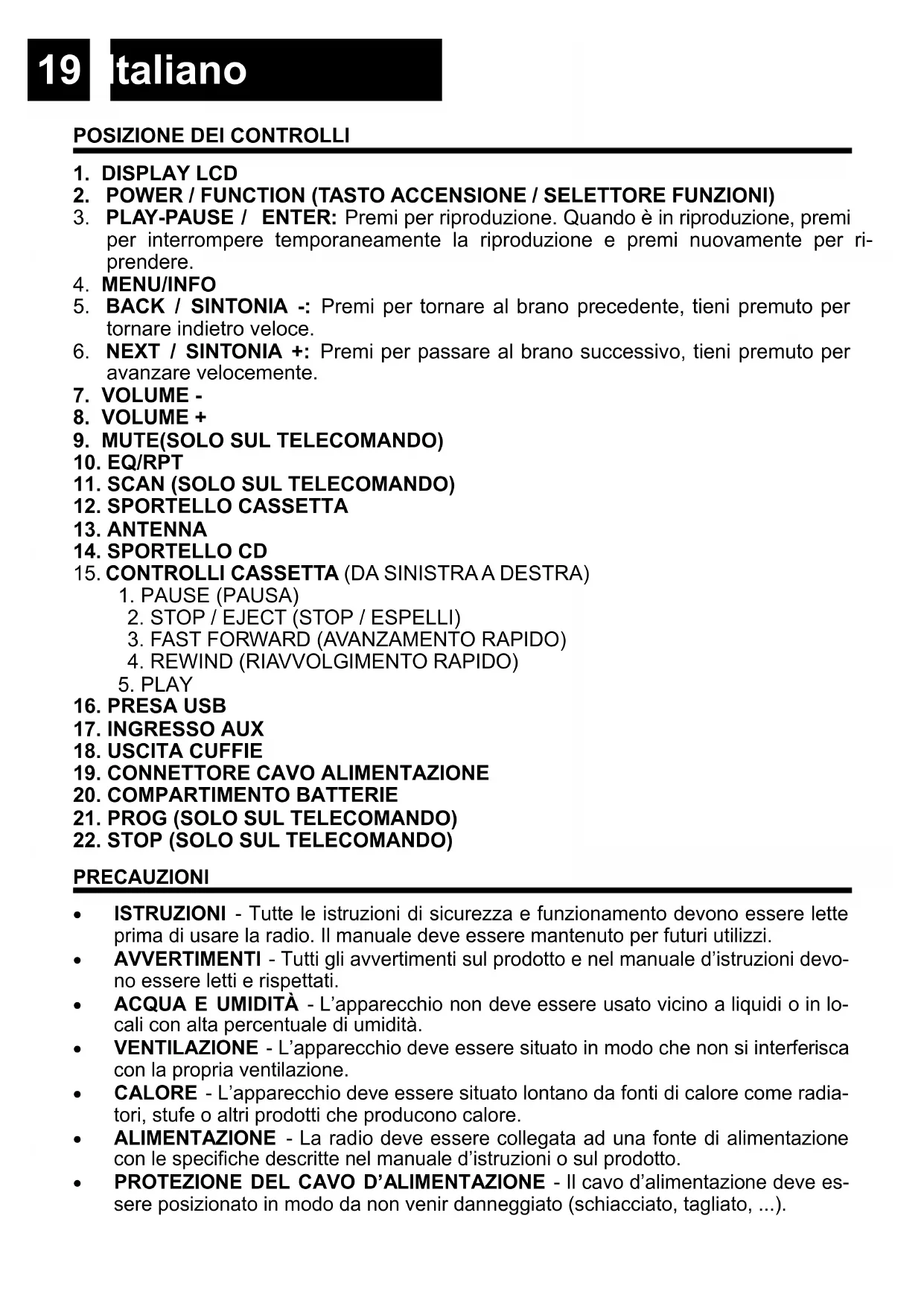 - ISTRUZIONI - Tutte le istruzioni di sicurezza e funzionamento devono essere lette prima di usare la radio. Il manuale deve essere mantenuto per futuri utilizzi.