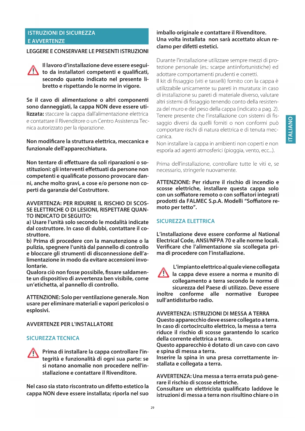 SICUREZZA TECNICA Prima di installare la cappa controllare l'in- tegrità e funzionalità di ogni sua parte: se si notano anomalie non procedere nell'in- stallazione e contattare il Rivenditore. Nel caso sia stato riscontrato un difetto estetico la cappa NON deve essere installata; riporla nel suo imballo originale e contattare il Rivenditore. Una volta installata non sarà accettato alcun re- clamo per difetti estetici. Durante l'installazione utilizzare sempre mezzi di pro- tezione personale (es.: scarpe antiinfortunistiche) ed adottare comportamenti prudenti e corretti. Il kit di fissaggio (viti e tasselli) fornito con la cappa è utilizzabile unicamente su pareti in muratura: in caso di installazione su pareti di materiale diverso, valutare altri sistemi di fissaggio tenendo conto della resisten- za del muro e del peso della cappa (indicato a pag. 2). Tenere presente che l’installazione con sistemi di fis- saggio diversi da quelli forniti o non conformi può comportare rischi di natura elettrica e di tenuta mec- canica. Non installare la cappa in ambienti non coperti e non esporla ad agenti atmosferici (pioggia, vento, ecc...). Prima dell’installazione, controllare tutte le viti e, se necessario, stringerle nuovamente. ATTENZIONE: Per ridurre il rischio di incendio e scosse elettriche, installare questa cappa solo con un soatore remoto o con soatori integrati prodotti da FALMEC S.p.A. Modelli “Soatore re- moto per tetto”. SICUREZZA ELETTRICA L’installazione deve essere conforme al National Electrical Code, ANSI/NFPA 70 e alle norme locali. Vericare che l’alimentazione sia scollegata pri- ma di procedere con l’installazione. L’impianto elettrico al quale viene collegata la cappa deve essere a norma e munito di collegamento a terra secondo le norme di sicurezza del Paese di utilizzo. Deve essere inoltre conforme alle normative Europee sull’antidisturbo radio.
