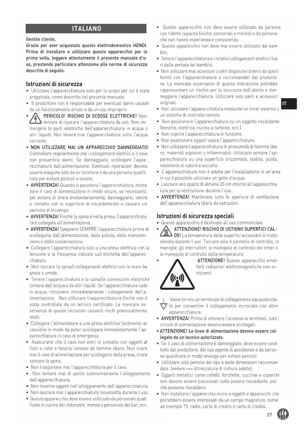 ITALIANO Gentile cliente, Grazie per aver acquistato questo elettrodomestico HENDI. Prima di installare e utilizzare questo apparecchio per la prima volta, leggere attentamente il presente manuale d’u