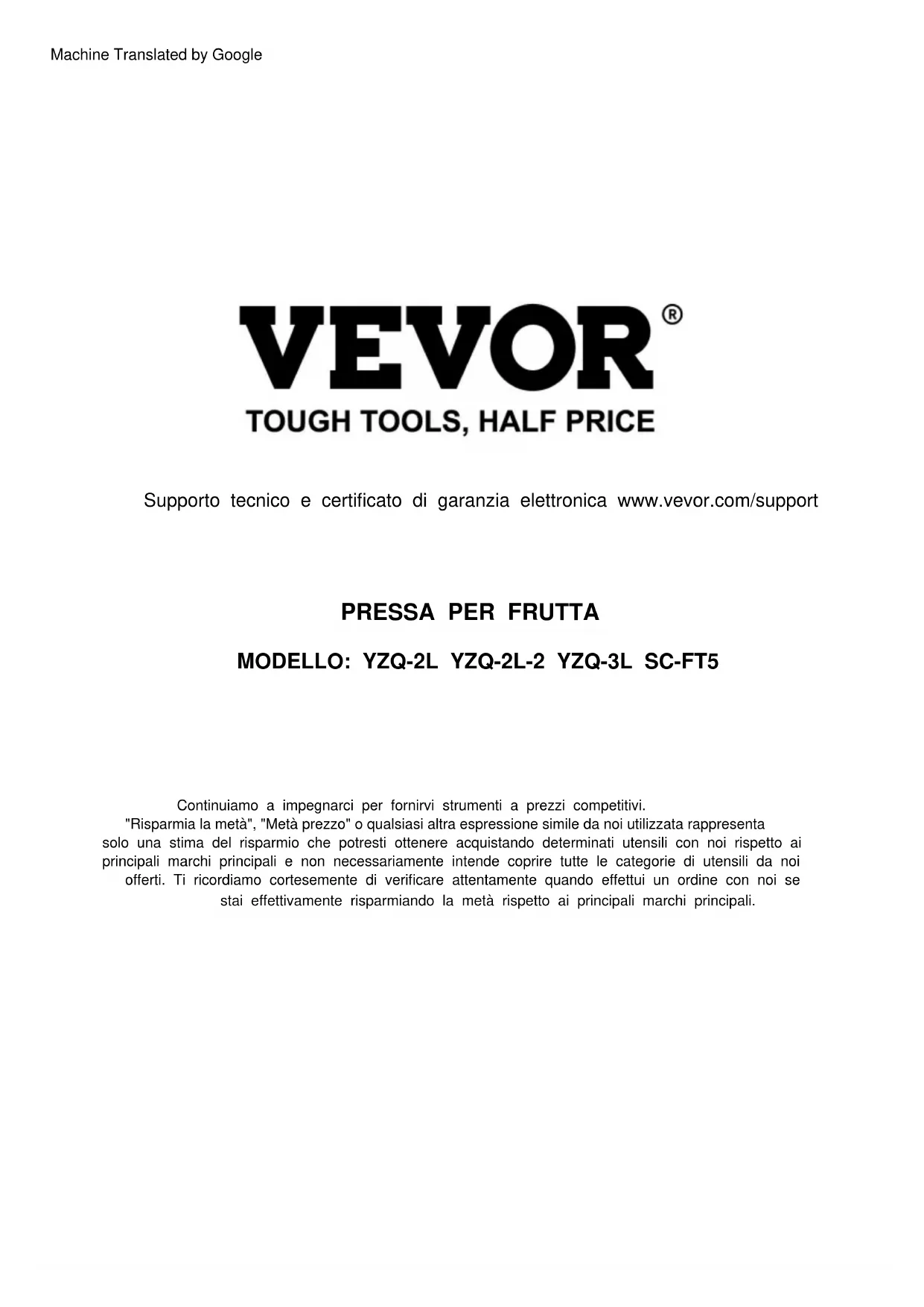 Supporto tecnico e certificato di garanzia elettronica www.vevor.com/support "Risparmia la metà", "Metà prezzo" o qualsiasi altra espressione simile da noi utilizzata rappresenta solo una stima del risparmio che potresti ottenere acquistando determinati utensili con noi rispetto ai principali marchi principali e non necessariamente intende coprire tutte le categorie di utensili da noi offerti. Ti ricordiamo cortesemente di verificare attentamente quando effettui un ordine con noi se stai effettivamente risparmiando la metà rispetto ai principali marchi principali. Continuiamo a impegnarci per fornirvi strumenti a prezzi competitivi. Machine Translated by GoogleQuesta è l'istruzione originale, si prega di leggere attentamente tutte le istruzioni del manuale prima di utilizzare. VEVOR si riserva una chiara interpretazione del nostro manuale utente. L'aspetto del prodotto sarà soggetto al prodotto ricevuto. Vi preghiamo di perdonarci se non vi informeremo di nuovo se ci sono aggiornamenti tecnologici o software sul nostro prodotto. MODELLO: YZQ-2L YZQ-2L-2 YZQ-3L SC-FT5 Hai domande sui prodotti? Hai bisogno di supporto tecnico? Non esitare a contattarci: Servizio Clienti@vevor.com Pressa per frutta HAI BISOGNO DI AIUTO? CONTATTACI!