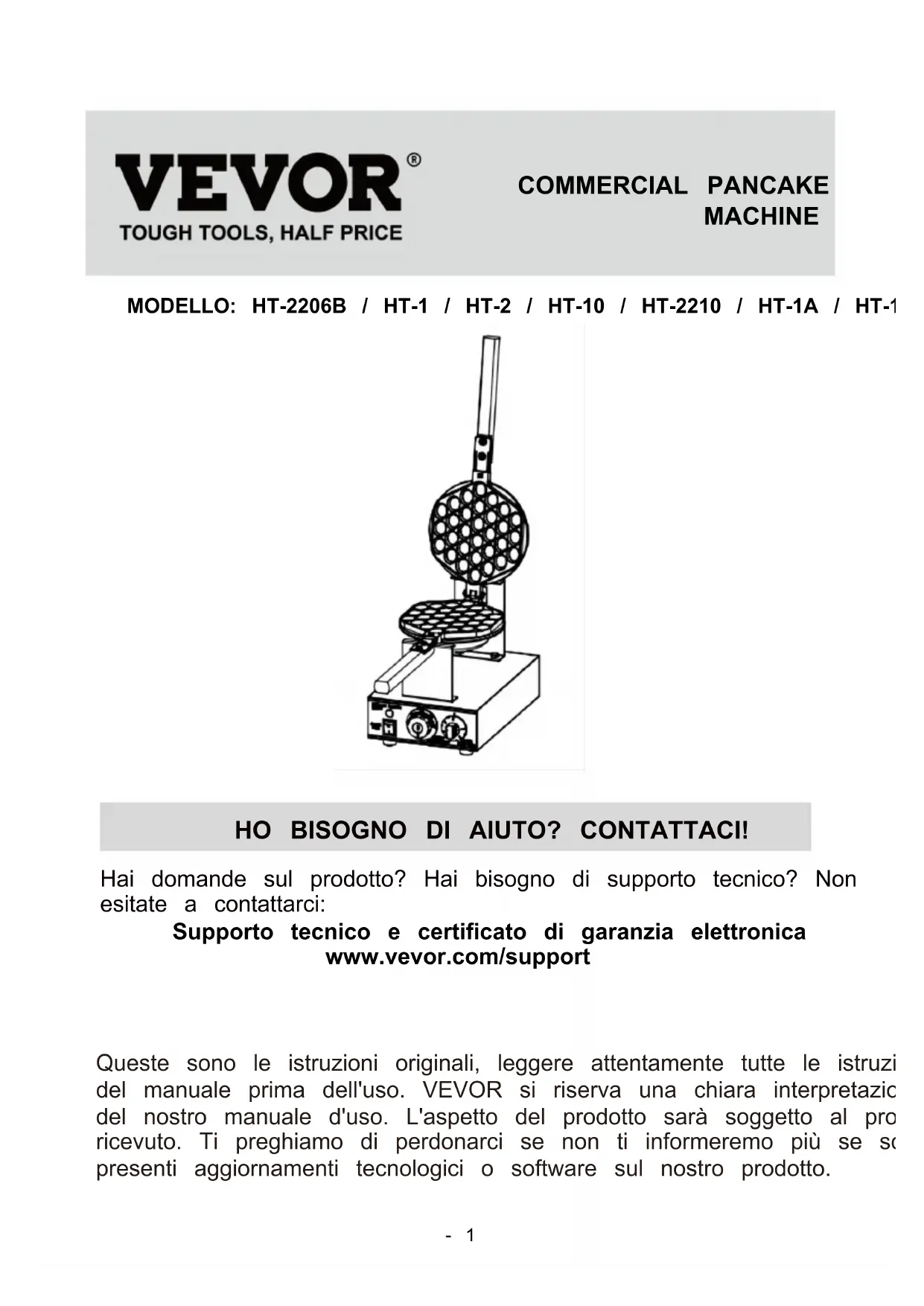 HT-2210 / HT-1A / HT-119 We continue to be committed to provide you tools with competitive price. "Save Half", "Half Price" or any other similar expressions used by us only represents an estimate of savings you might benefit from buying certain tools with us compared to the major top brands and does not necessarily mean to cover all categories of tools offered by us. You are kindly reminded to verify carefully when you are placing an order with us if you are actually saving half in comparison with the top major brands.- 4 -- 1 - MODELLO: HT-2206B / HT-1 / HT-2 / HT-10 / HT-2210 / HT-1A / HT-119 HO BISOGNO DI AIUTO? CONTATTACI! Hai domande sul prodotto? Hai bisogno di supporto tecnico? Non esitate a contattarci: Supporto tecnico e certificato di garanzia elettronica www.vevor.com/support Queste sono le istruzioni originali, leggere attentamente tutte le istruzioni del manuale prima dell'uso. VEVOR si riserva una chiara interpretazione del nostro manuale d'uso. L'aspetto del prodotto sarà soggetto al prodotto ricevuto. Ti preghiamo di perdonarci se non ti informeremo più se sono presenti aggiornamenti tecnologici o software sul nostro prodotto. COMMERCIAL PANCAKE MACHINE- 2 - Avvertenza: per ridurre il rischio di lesioni, l'utente deve leggere attentamente il manuale di istruzioni. Solo per uso interno. Fare attenzione alle alte temperature per evitare ustioni. CORRETTO SMALTIMENTO Questo prodotto è soggetto alle disposizioni della Direttiva Europea 2012/19/CE. Il simbolo del bidone della spazzatura barrato indica che nell'Unione Europea il prodotto richiede la raccolta differenziata dei rifiuti. Ciò vale per il prodotto e tutti gli accessori contrassegnati da questo simbolo. I prodotti contrassegnati come tali non possono essere smaltiti con i normali rifiuti domestici, ma devono essere portati in un punto di raccolta per il riciclaggio di dispositivi elettrici ed elettronici La conformità è una certificazione di sicurezza CE e Regno Unito.